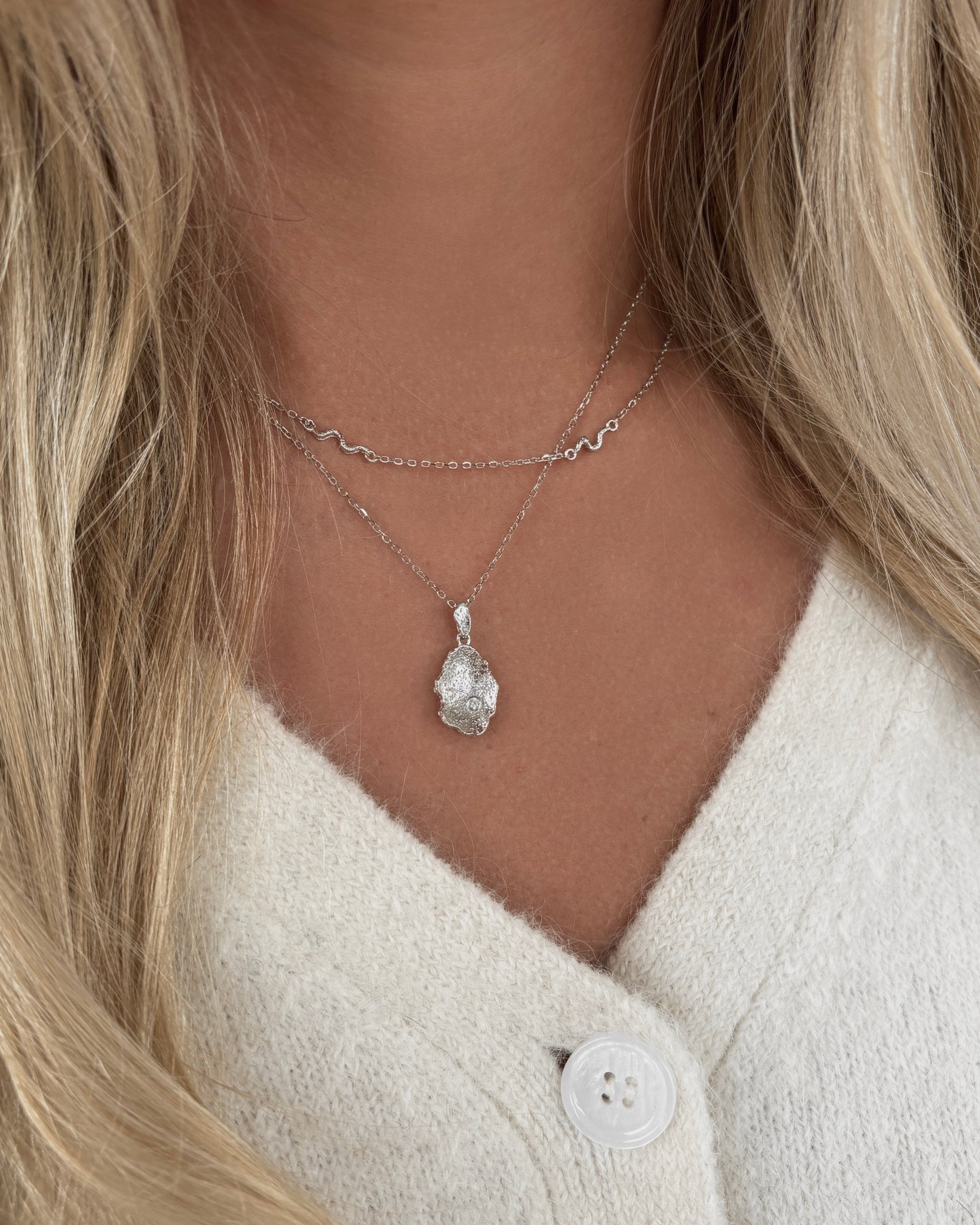 Hydra Necklace er en smuk halskæde, der fremhæver et råt og unikt design inspireret af naturens vilde skønhed. Vedhænget har en organisk form, som bringer tankerne hen på naturens uperfekte skulpturer, og er prydet med en enkelt kubisk zirkon, som tilføjer et strejf af finesse og eksklusivitet.