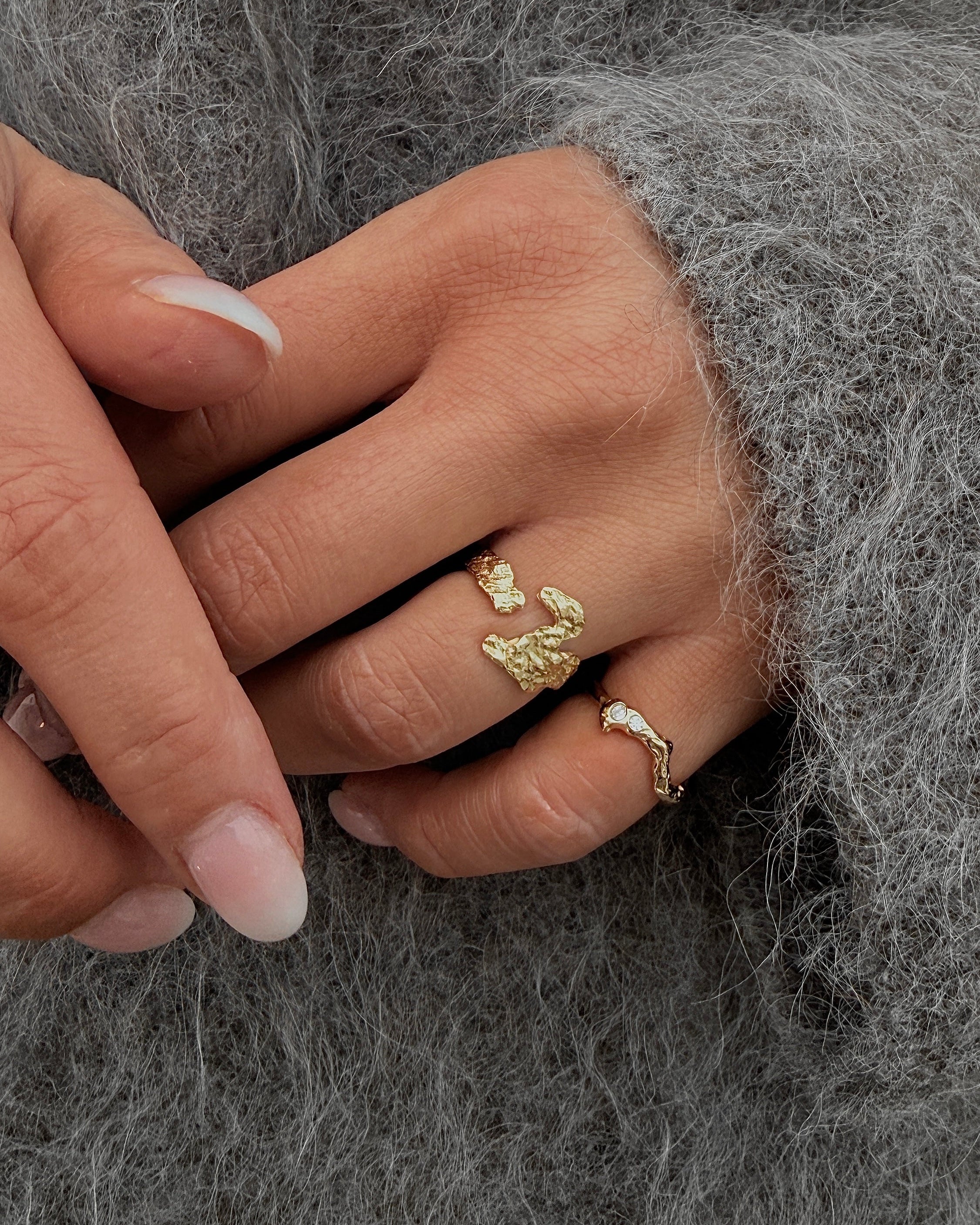 Samui Ring er en organisk formet ring, inspireret af kystens rå skønhed. Den ujævne, teksturerede overflade minder om klippeformationer formet af havets kraft, mens to funklende sten tilfører et strejf af sollys reflekteret i vandet.