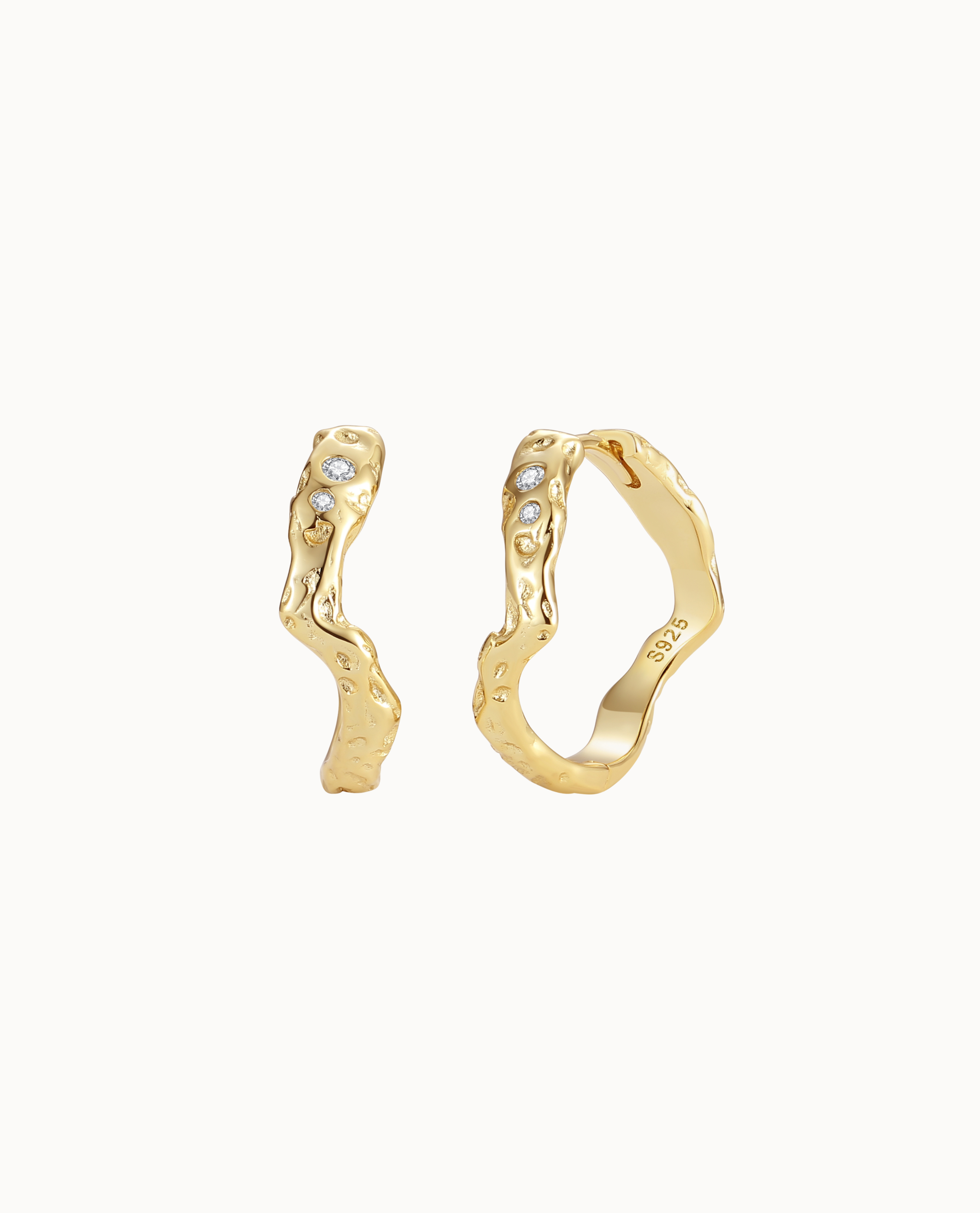 Saba Earrings er hoops med en bølgende, organisk form, inspireret af havets rytme og kystens rå teksturer. De funklende sten ligger spredt i overfladen som små skatte i strandkanten og tilføjer et strejf af elegance til det ellers rå udtryk.
