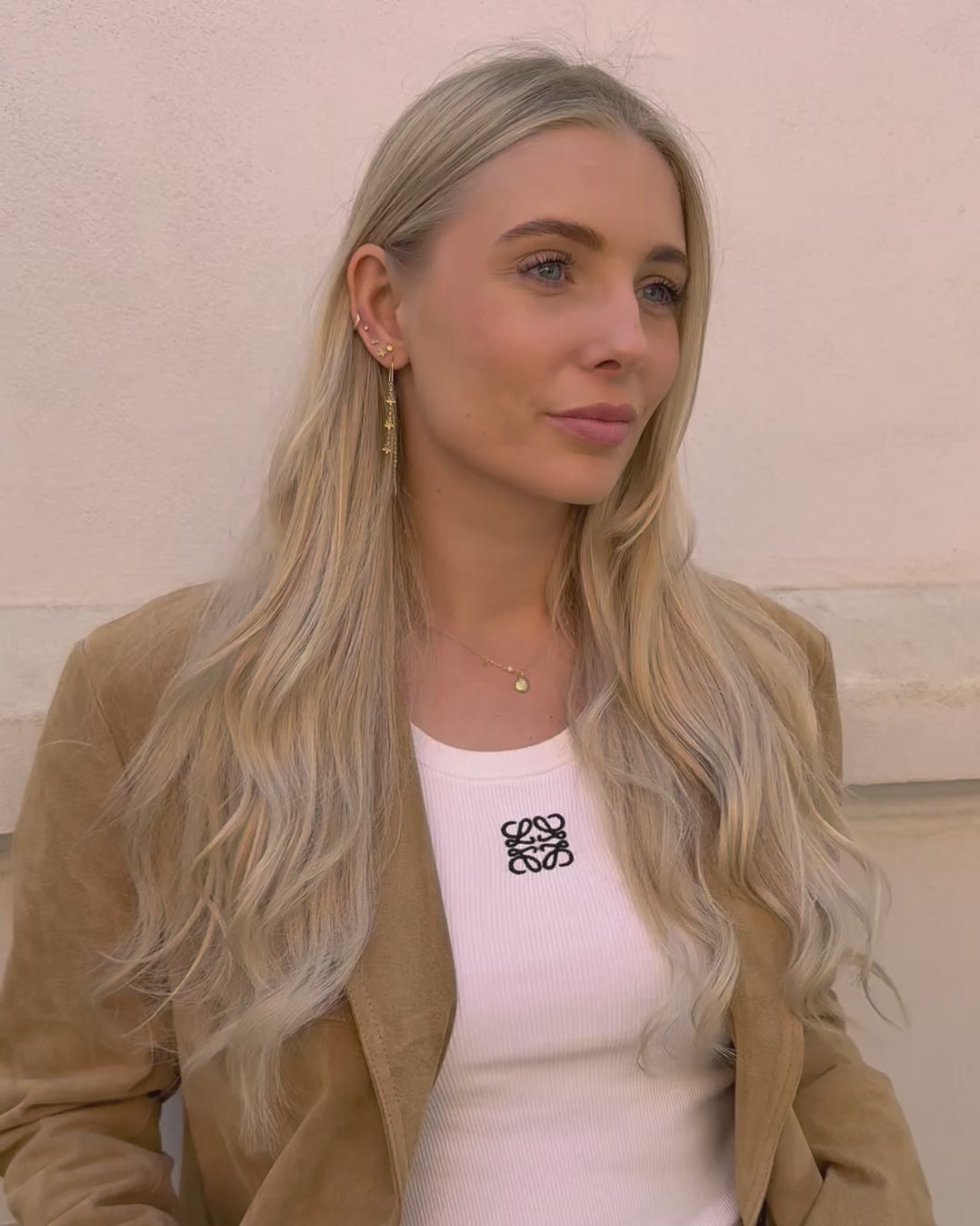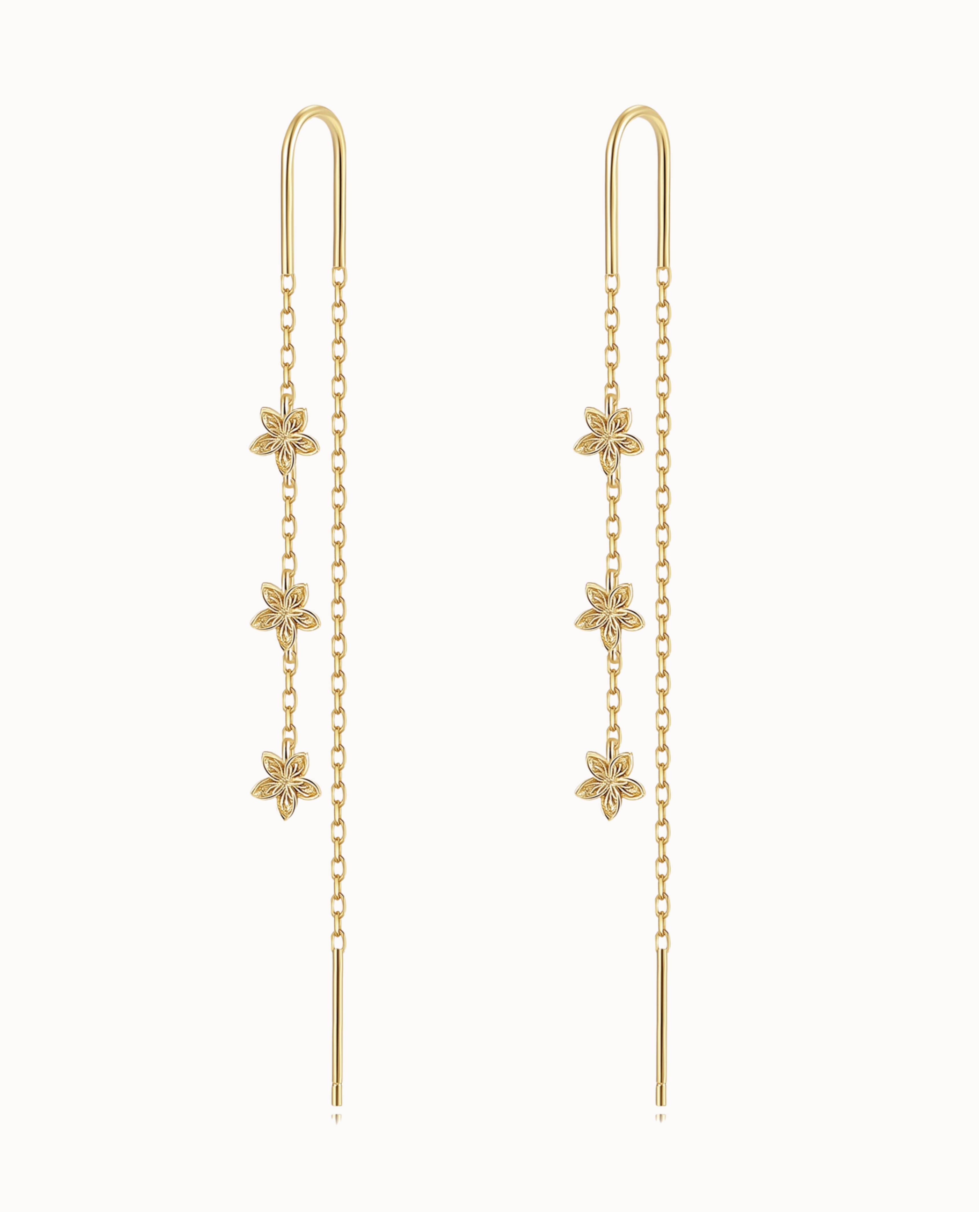 Zahra Earrings er elegante kædeøreringe, pyntet med små blomster i et let og svævende design. De fine blomsterdetaljer fordeler sig ned langs kæden og skaber en smuk bevægelse, når du bærer dem – som blomster, der danser i vinden ved kysten. Et feminint og luftigt udtryk, der kombinerer det enkle med det iøjnefaldende.