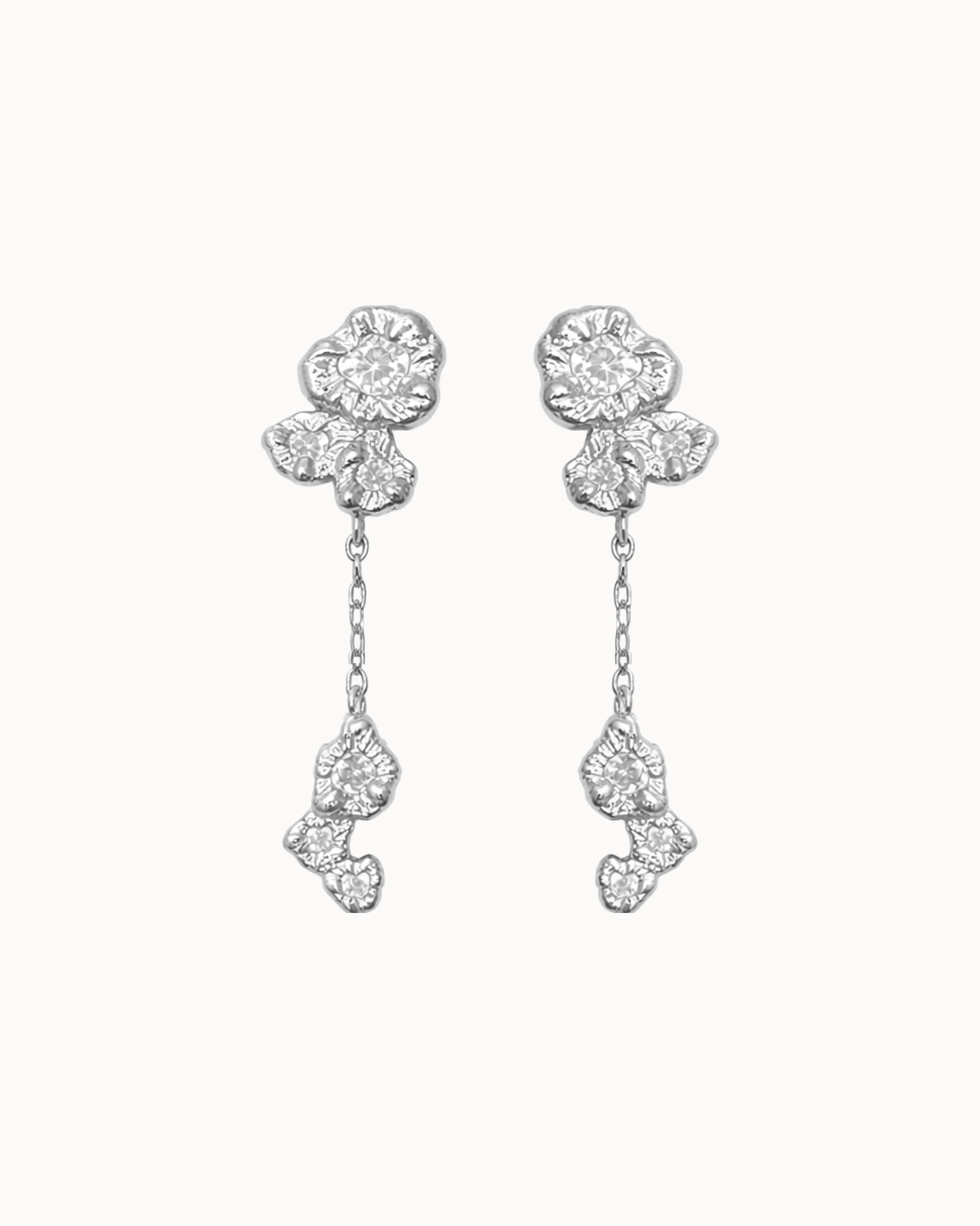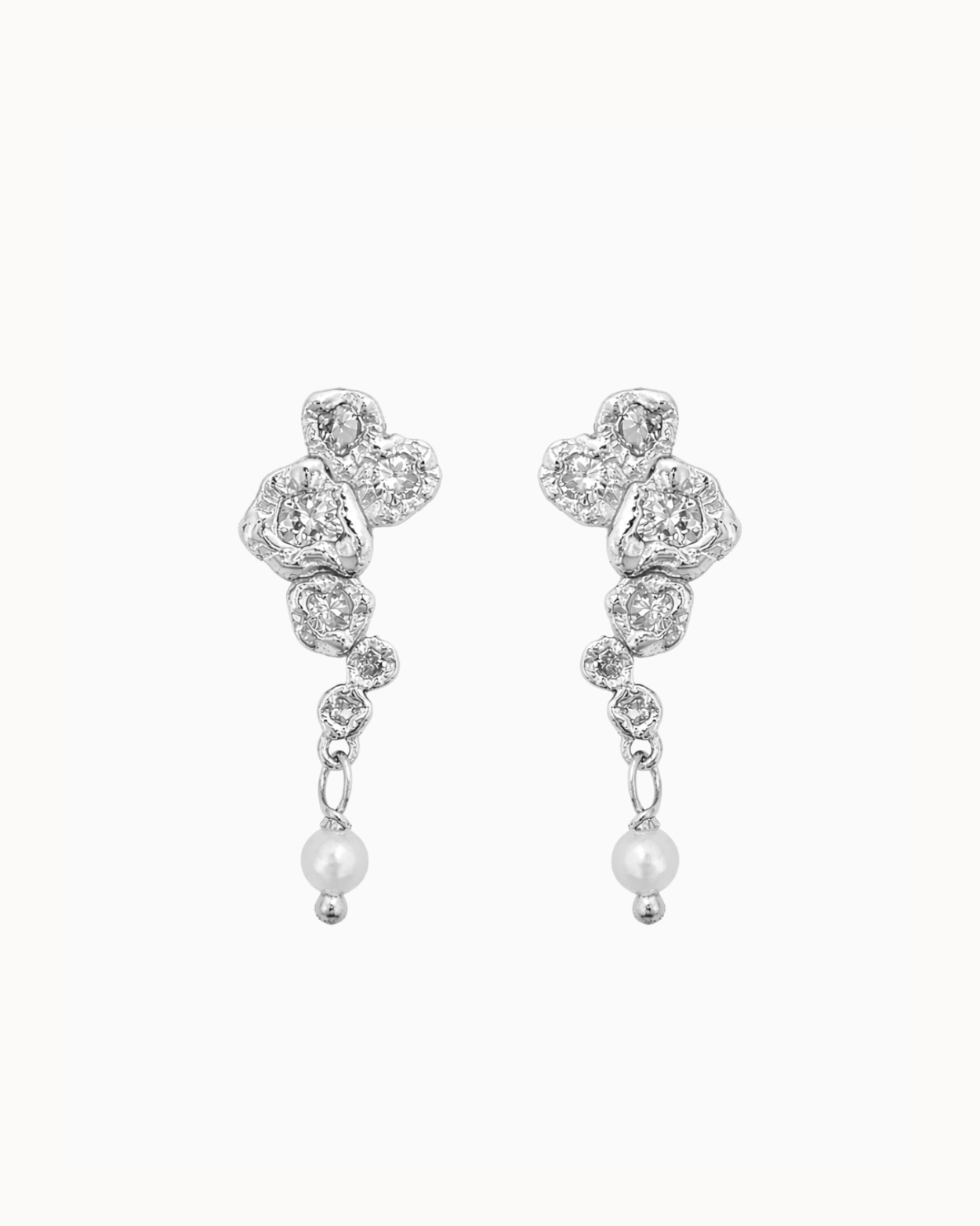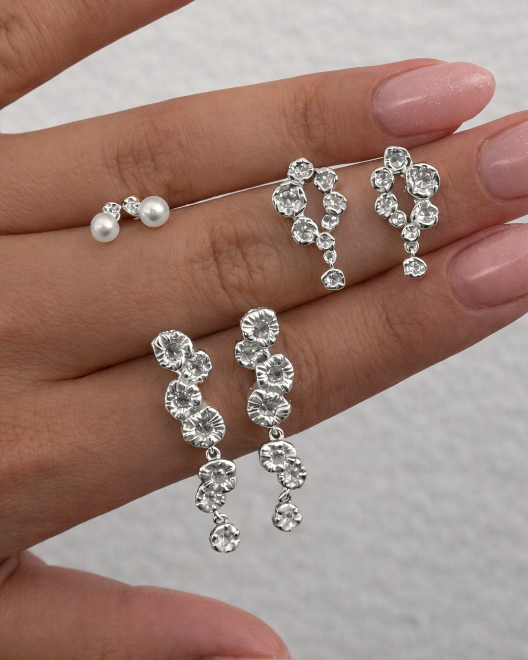 Hver form bærer præg af levende tekstur og uperfekt perfektion. Stenene er sat i bagfra, så de nærmest smelter ind i metallet og bliver ét med designet. Det giver et flydende, næsten drømmende udtryk – som om lyset bryder gennem havets overflade og fanges i smykket.