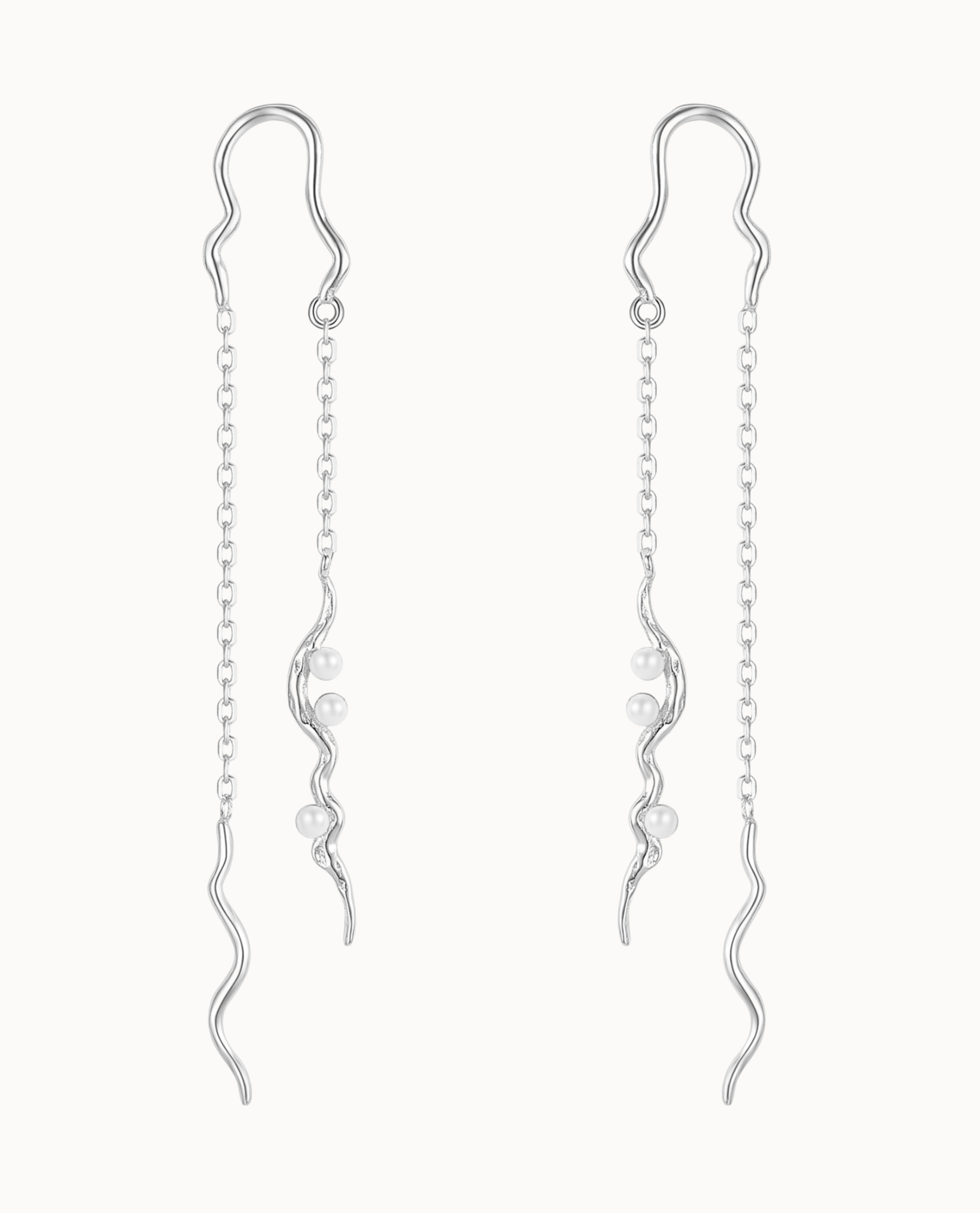 Velora Earrings har et bølgende og elegant design med lange kæder og skulpturelle former. De organiske linjer kombineres med små perler, der balancerer det rå og det raffinerede. Et let og iøjnefaldende udtryk fra Siren kollektionen.