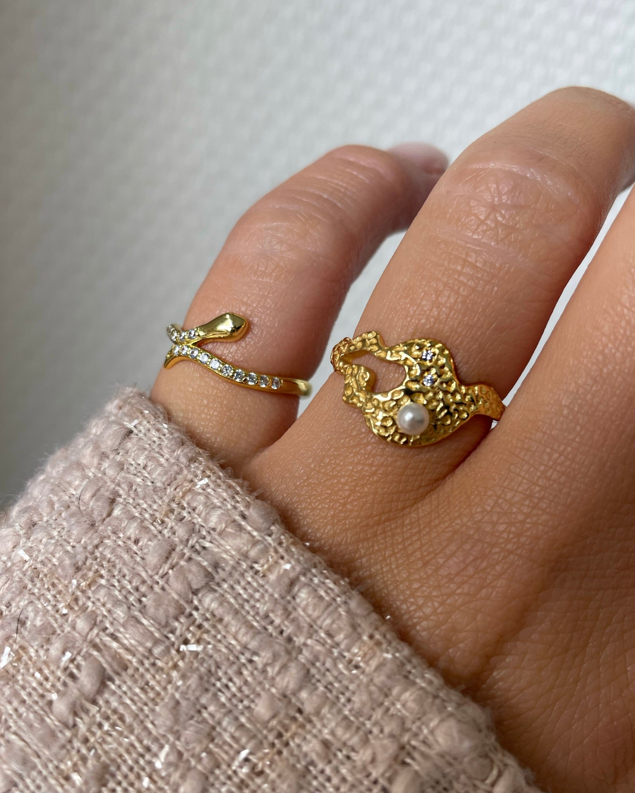 Adira Ring er en smuk statement ring med et tidsløst design. Ringen har en organisk banket overfalde med både perler og sten. Ringen gør sig godt alene, da den er chunky, men kan også nemt styles med andre styles. En perfekt tilføjelse til ethvert outfit. Adira Ring er en del af Reef kollektionen, som er inspireret af det smukke koralrev.