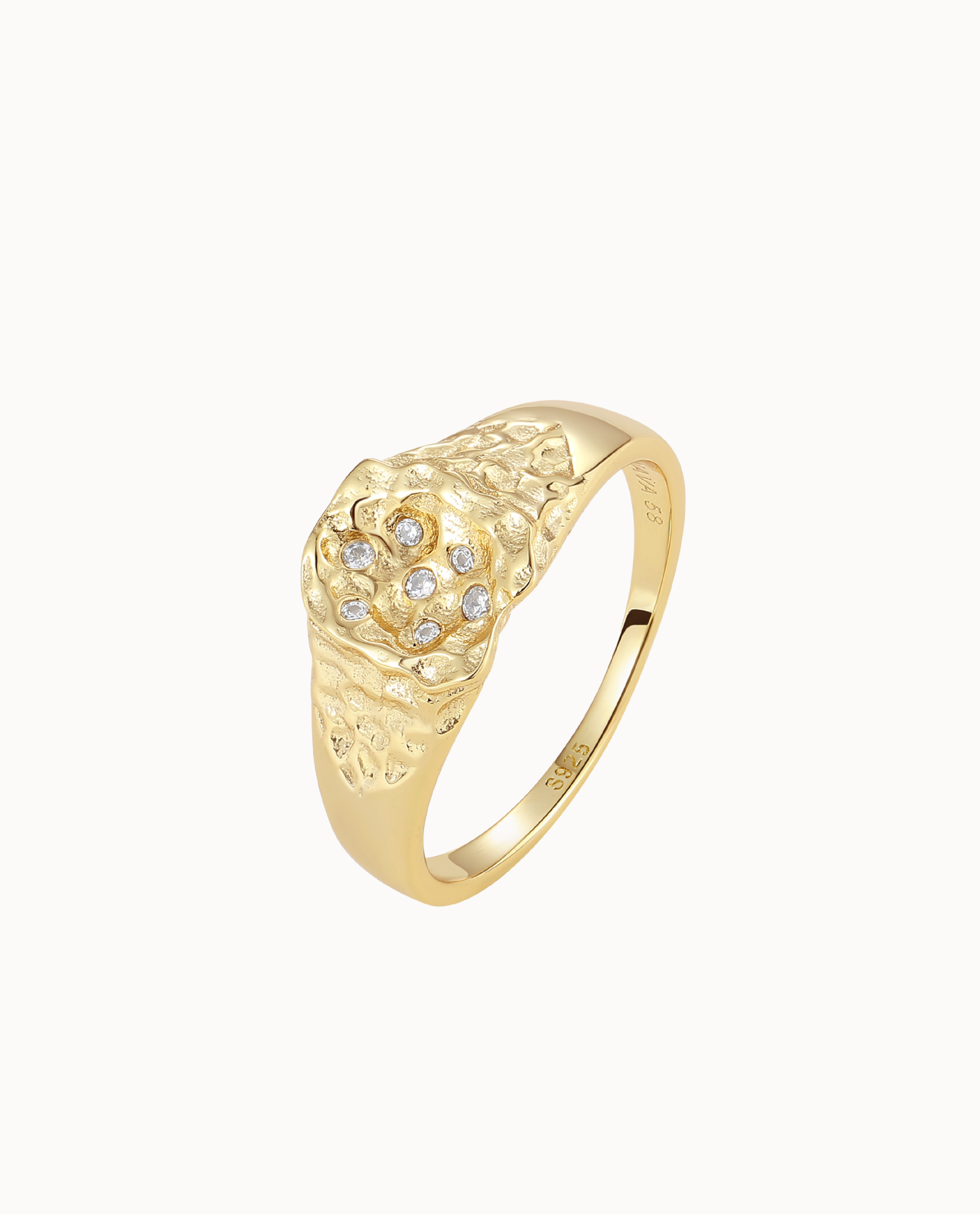 Isis ringen er et unikt smykke med en tekstur, der minder om bølger af sand, og en midte prydet med glitrende zirkoner, der skaber et elegant og luksuriøst udtryk. Den har en organisk form, der giver ringen en moderne og tidløs følelse.