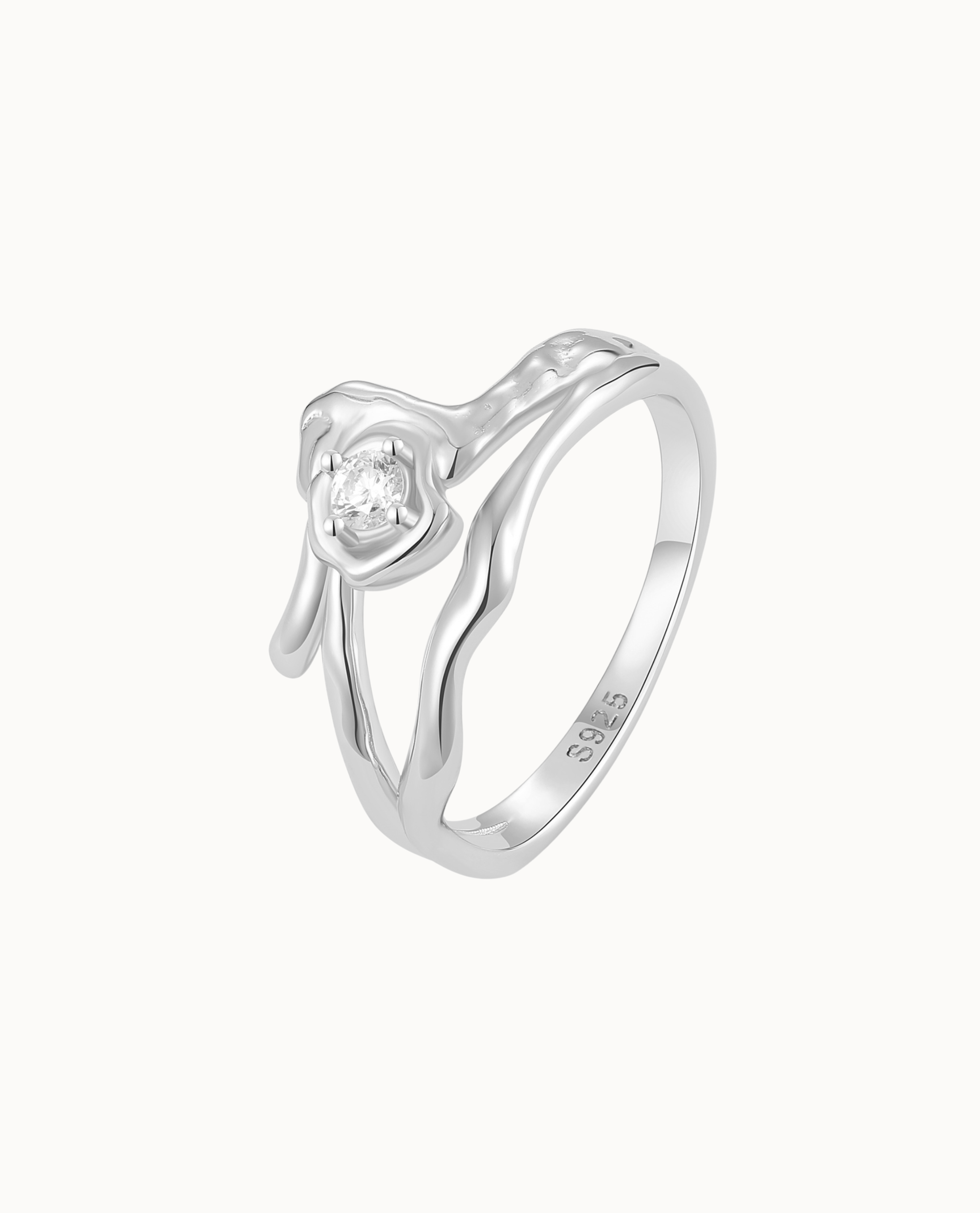 Tahiti Ring er en elegant og organisk ring med et bølgende design, hvor en klar sten er indfattet i en blød, skulpturel form. Den åbne silhuet og bevægelige linjer giver ringen et let og naturligt udtryk – som skabt af havets bevægelser. Et feminint statement med et glimt af havets skatte.