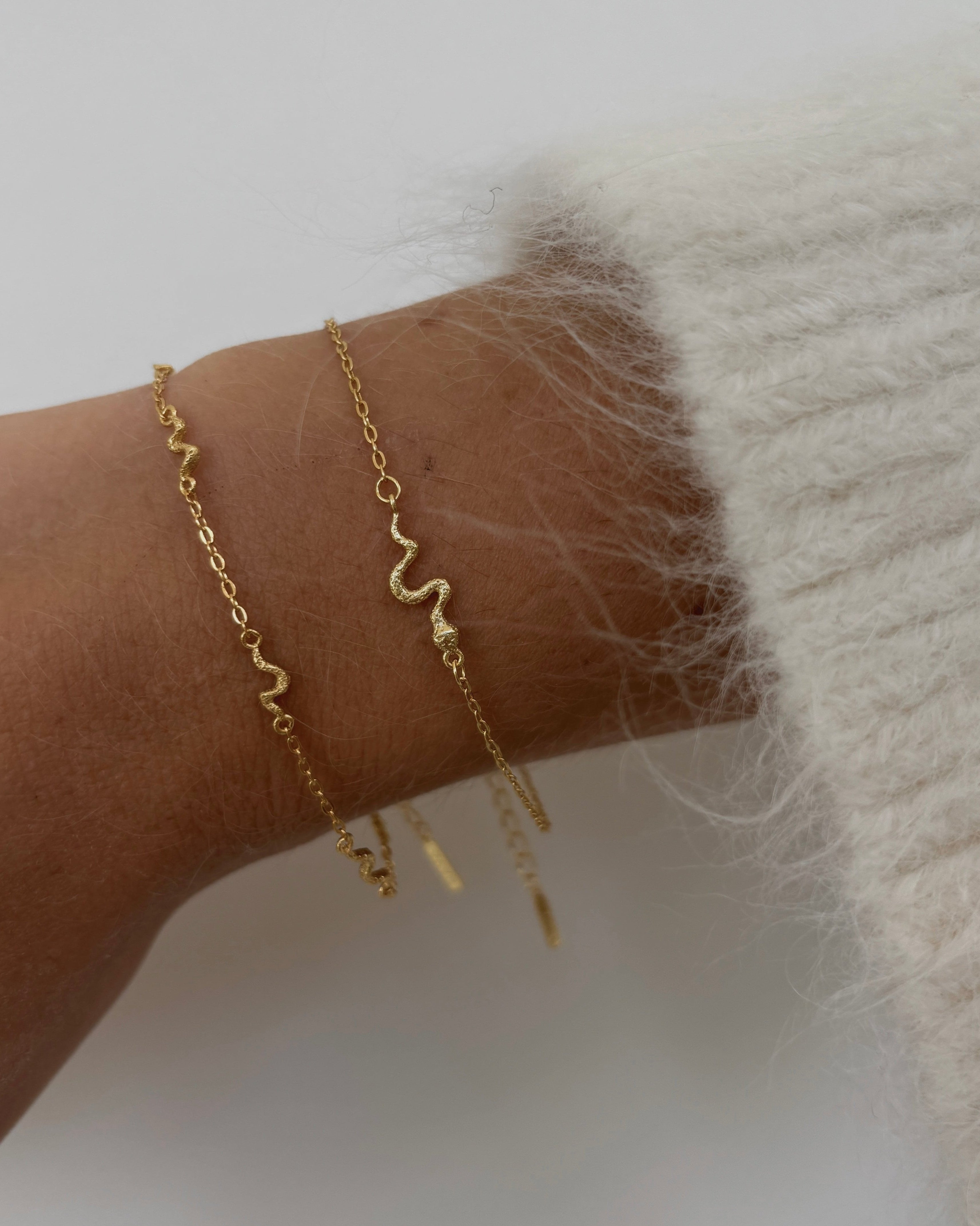 Elaphe Bracelet er et delikat og stilfuldt armbånd med en fin kæde og et lille fint slangevedhæng i midten. Den detaljerede slangeform tilfører et subtilt strejf af mystik og symbolik, mens det minimalistiske design gør armbåndet alsidigt og let at bære. Perfekt til at skabe et sofistikeret og edgy udtryk, enten alene eller i kombination med andre smykker.