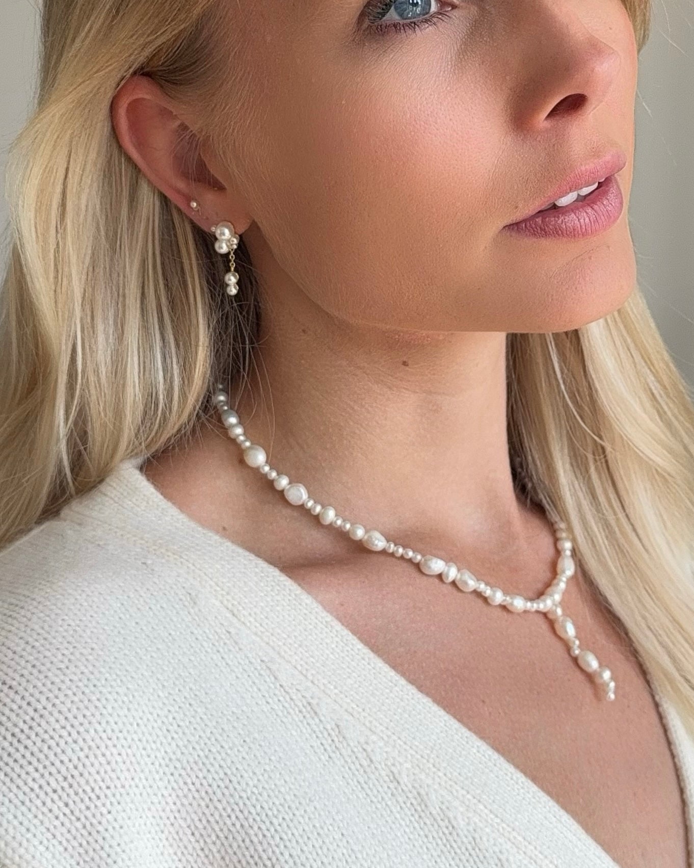 Etta Necklace består af perler i forskellige former og størrelser, arrangeret i et unikt mønster med et elegant drop foran. Kombinationen af uregelmæssige og runde perler giver smykket et naturligt og sofistikeret udtryk – perfekt afstemt til Siren kollektionens havinspiration.