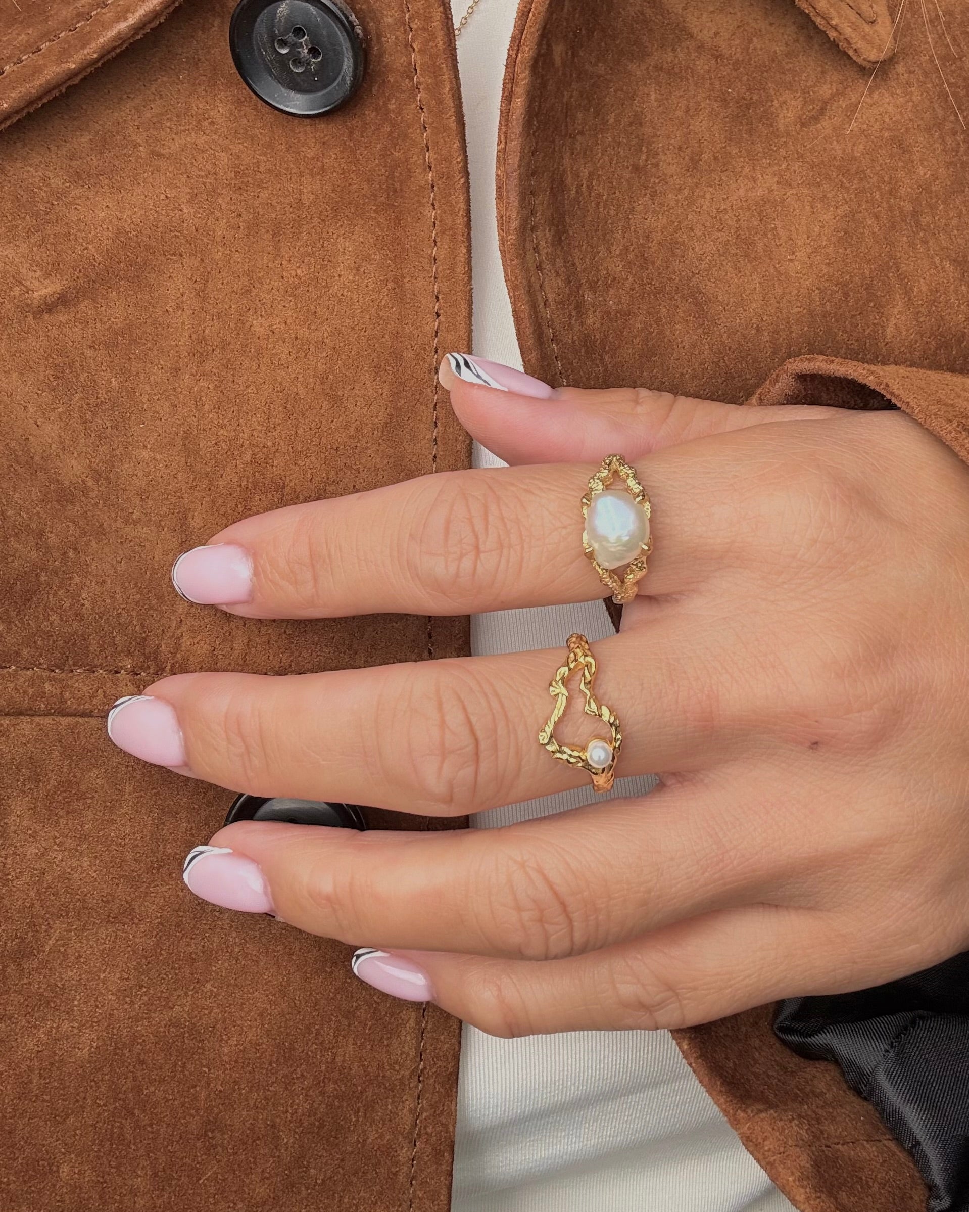 Hissandra Ring ist eine beeindruckende Mischung aus roher Natur und einzigartigen Details. Die große Barockperle wird von strukturierten Fassungen gehalten, die dem Ring einen kraftvollen, fast wilden Ausdruck verleihen. Die raue Textur und die klauenartigen Details bilden einen Kontrast zur Perle und verleihen dem Stück ein unverwechselbares und bemerkenswertes Design. Der Hissandra-Ring ist für diejenigen gedacht, die ein Statement-Schmuckstück suchen, das die Balance zwischen Natürlichkeit und Kraft aufbaut.