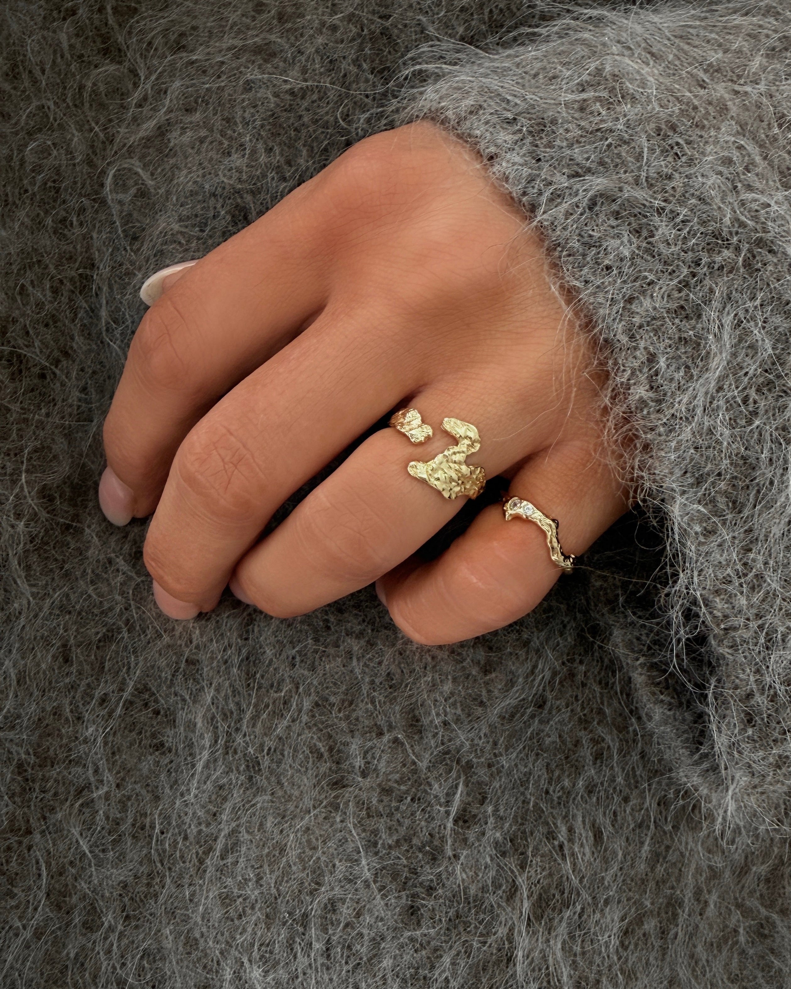Samui Ring is an organically shaped ring, inspired by the raw beauty of the coast. The uneven, textured surface is reminiscent of rock formations shaped by the power of the sea, while two sparkling stones add a touch of sunlight reflected in the water.