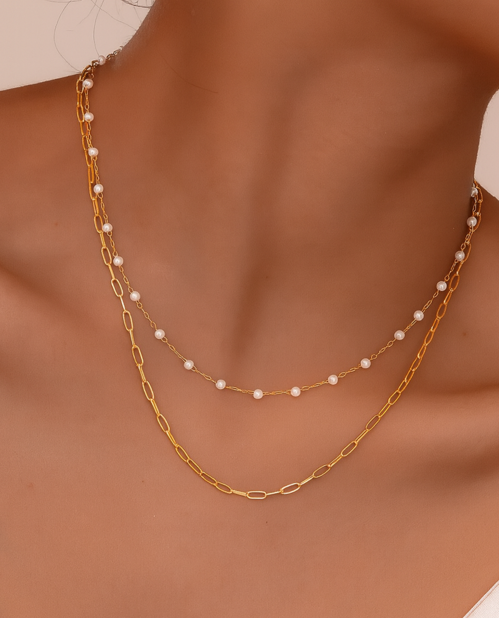 Noor er et elegant lag-på-lag halskæde design, hvor blanke guldkæder møder små, delikate perler. Kombinationen af de markante led og de fine detaljer giver et tidløst, men moderne udtryk, der løfter ethvert outfit – fra hverdag til fest.