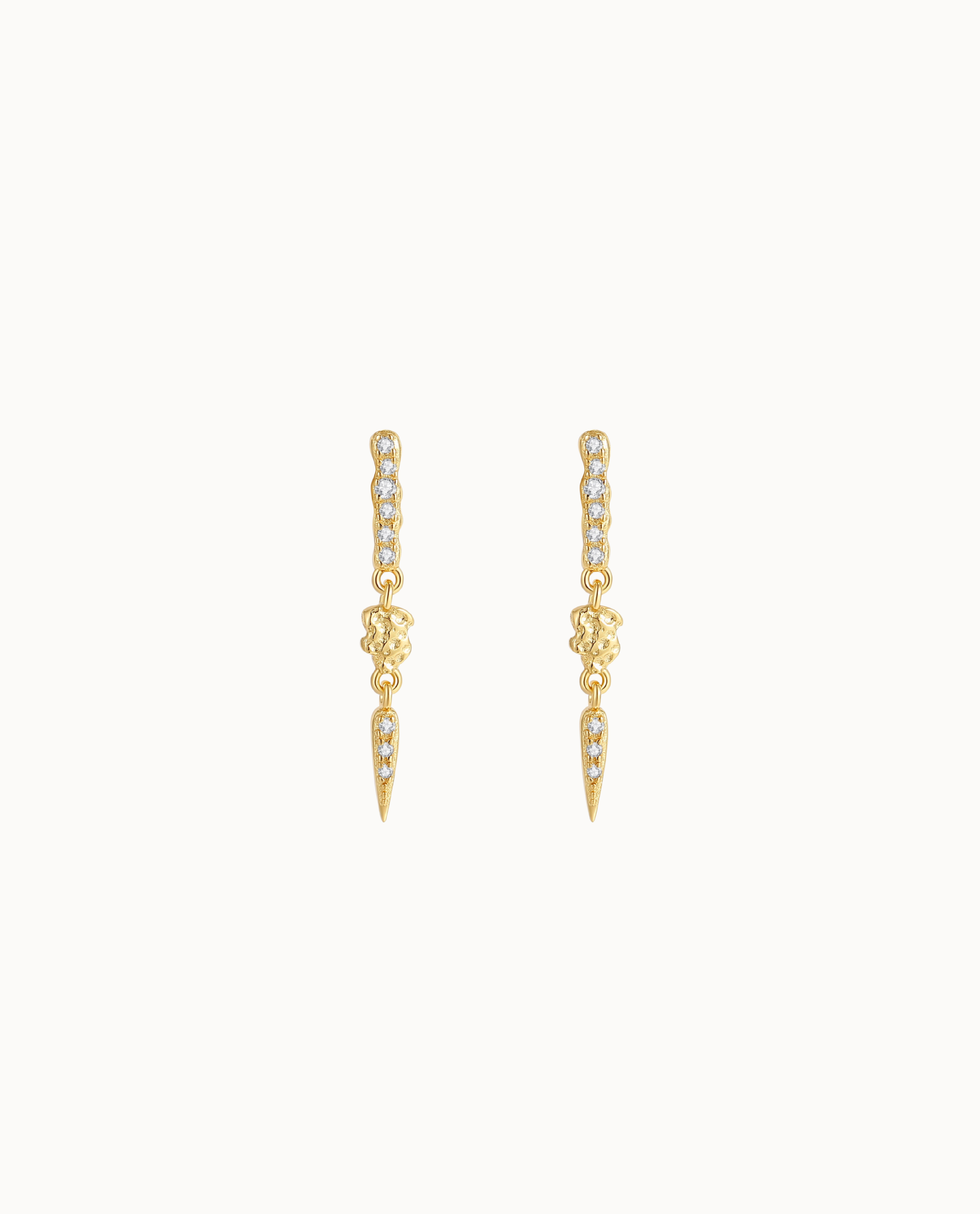 Cleopatra Earrings have an elegant and majestic design with a combination of sparkling zircons and textured details. The long, slender drops create a dramatic and sophisticated look, perfect for special occasions.