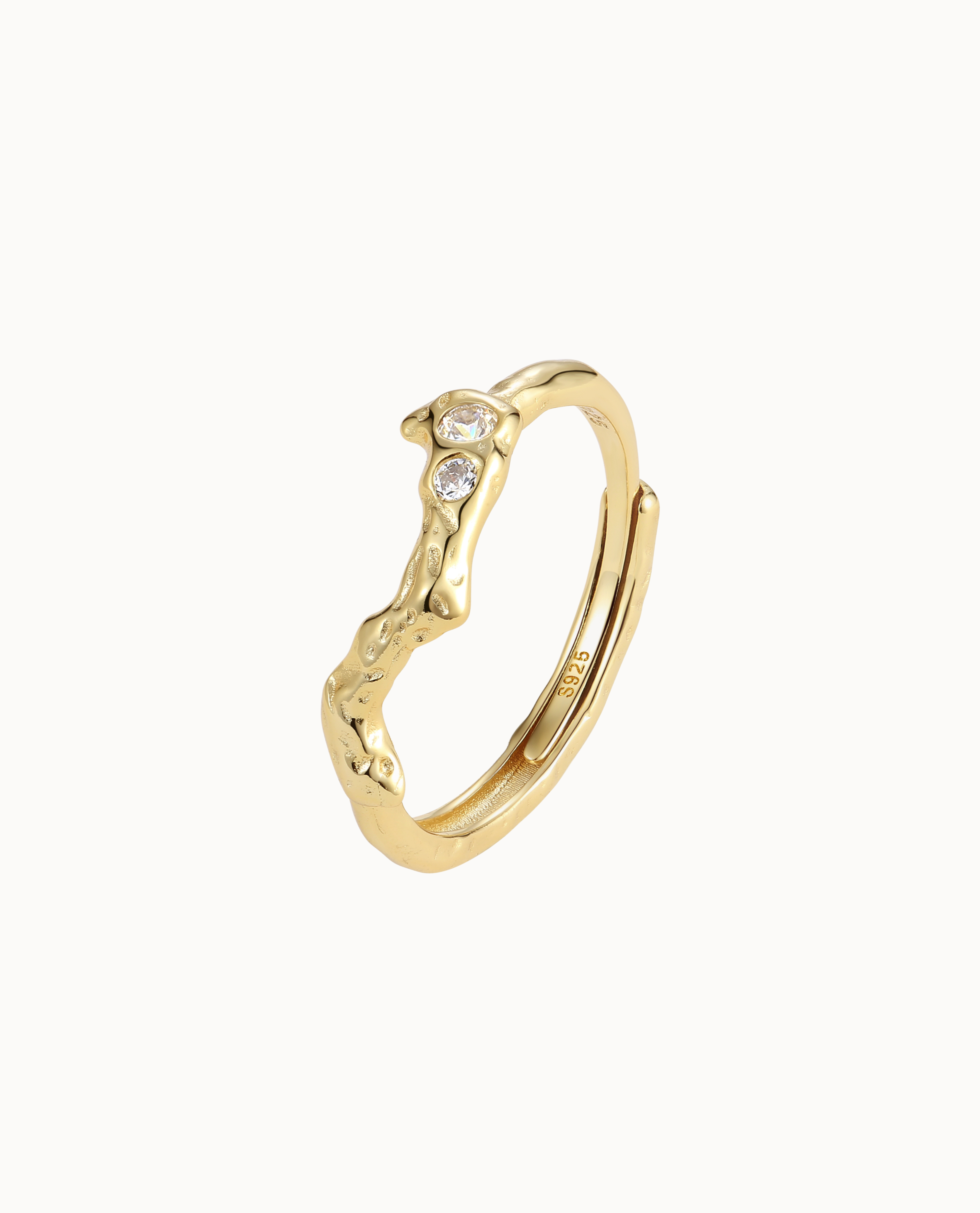 Samui Ring is an organically shaped ring, inspired by the raw beauty of the coast. The uneven, textured surface is reminiscent of rock formations shaped by the power of the sea, while two sparkling stones add a touch of sunlight reflected in the water.
