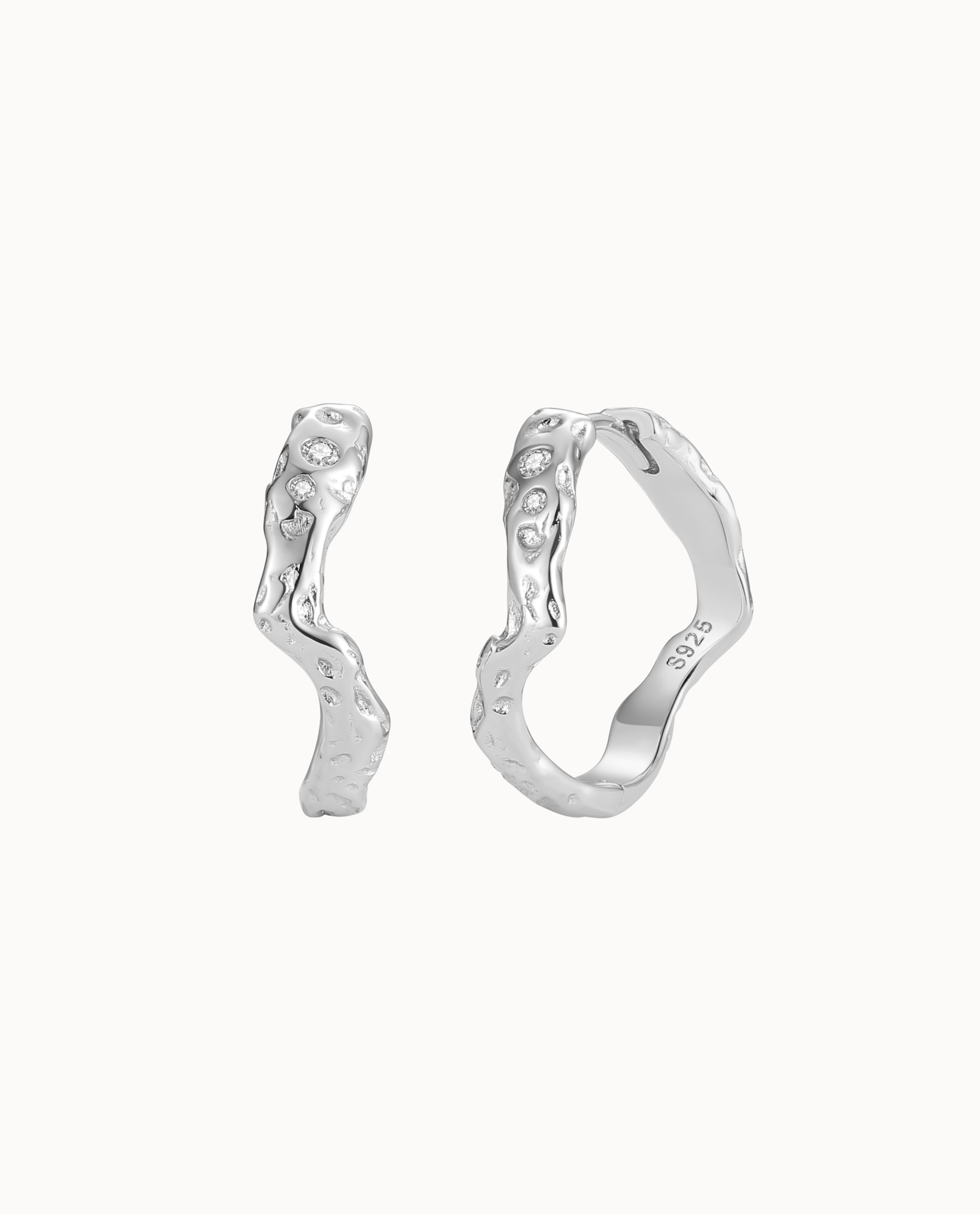 Elei Earrings are hoops with an undulating, organic shape, inspired by the rhythm of the sea and the raw textures of the coast. The sparkling stones lie scattered on the surface like little treasures on the shoreline, adding a touch of elegance to the otherwise raw expression. A striking design that can be worn alone or styled with other earrings for a personal look.