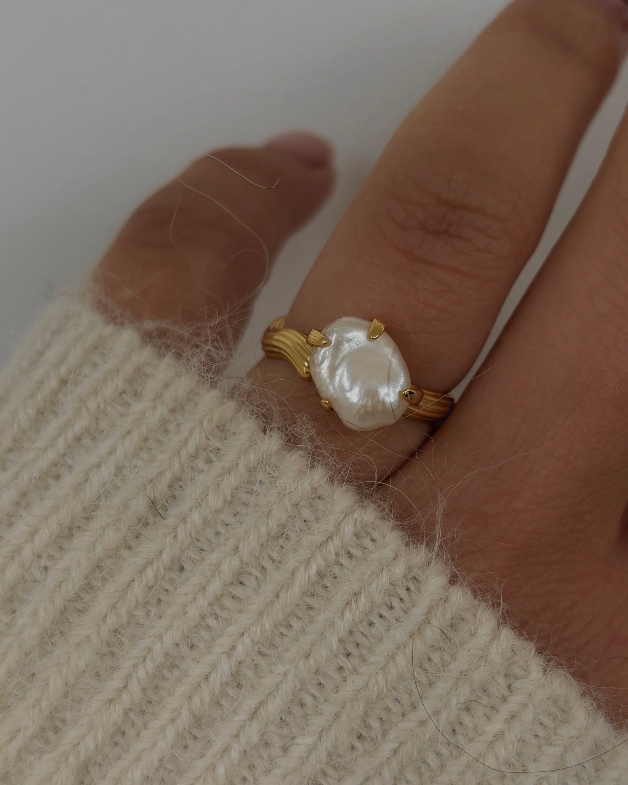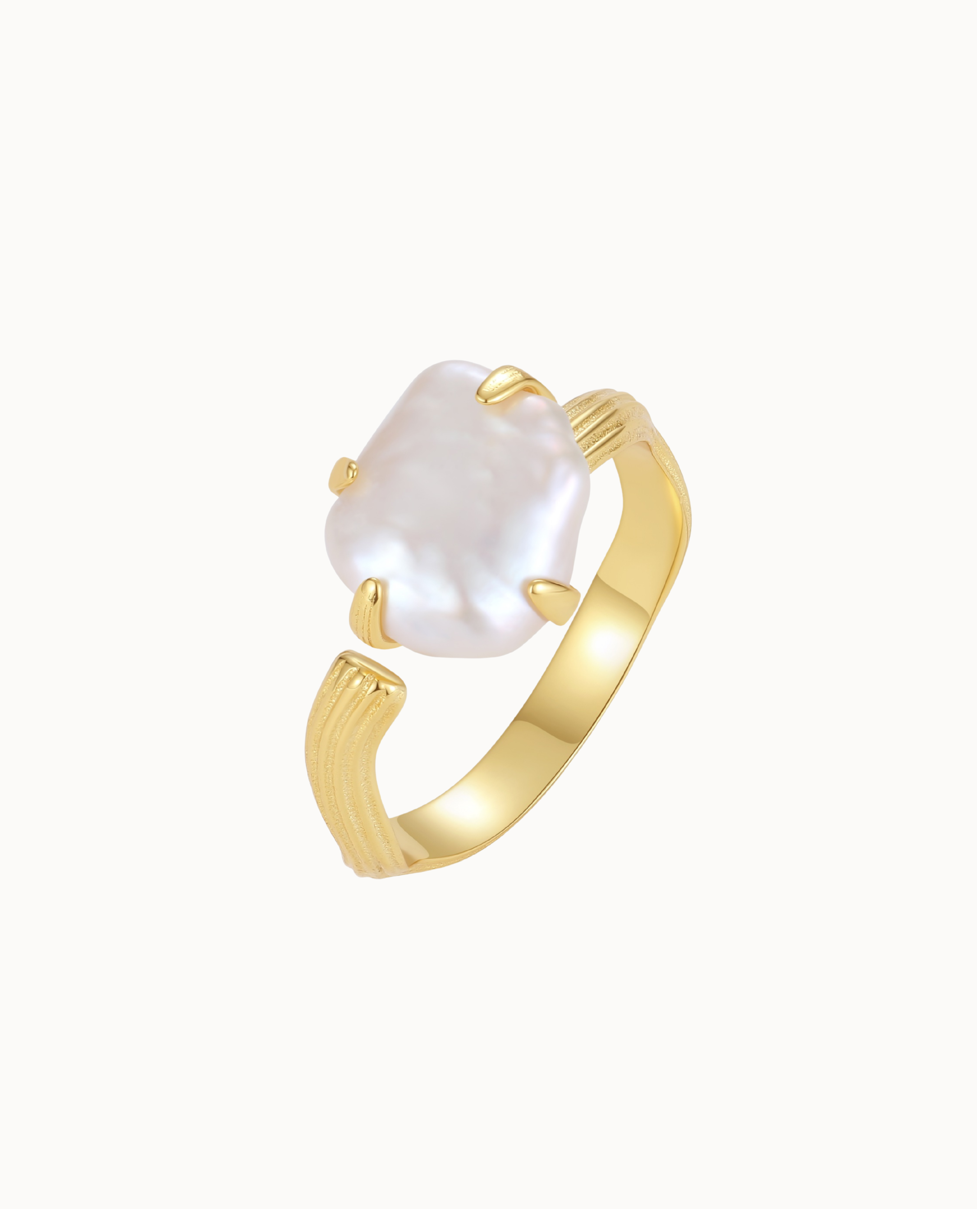 The Lorien Ring is an enchanting ring that captures attention with its unique beauty. It is adorned with a large, irregular freshwater pearl that creates a unique and natural center. Inspired by the waves of the ocean, the ring has an undulating texture that adds depth and character to its design.