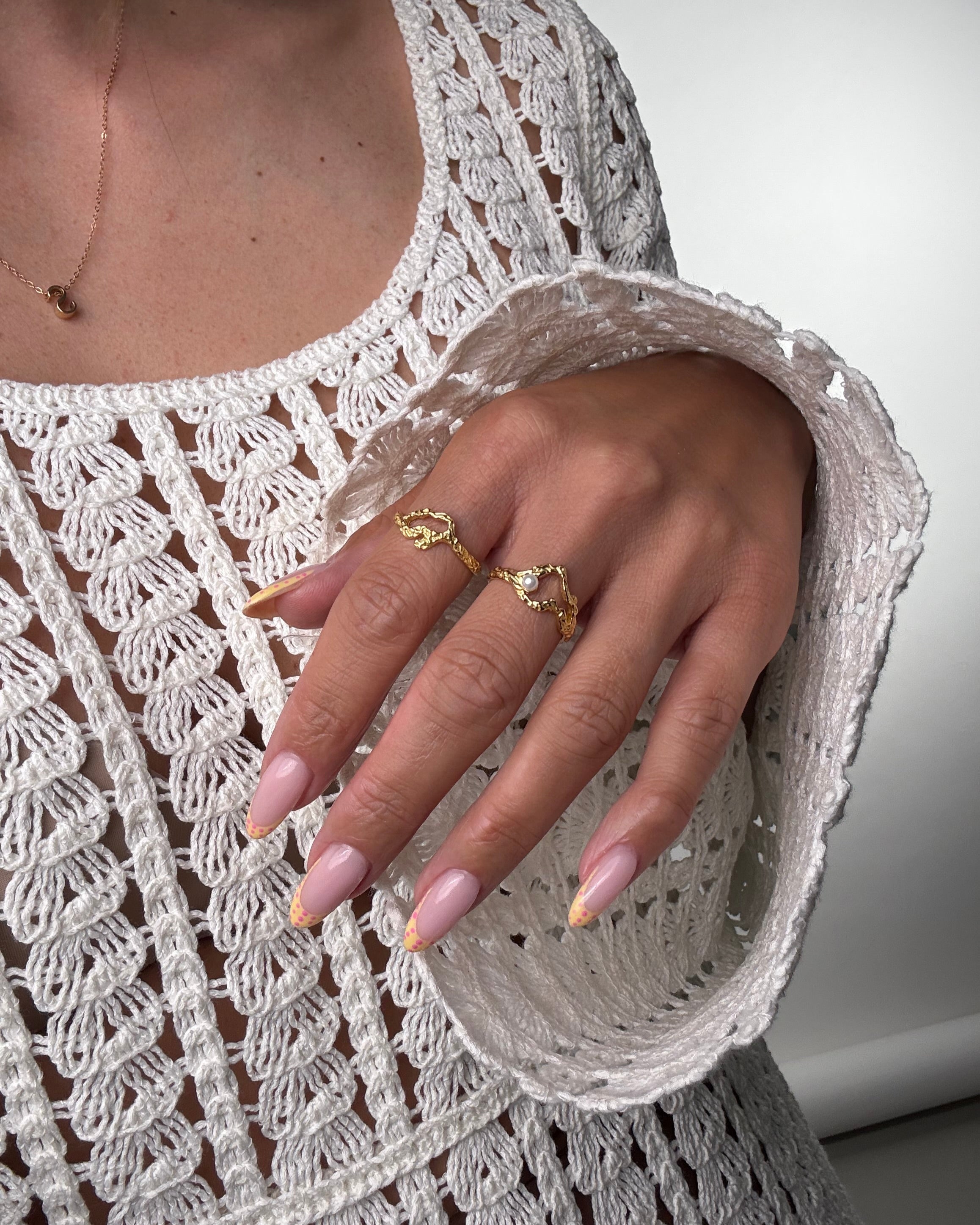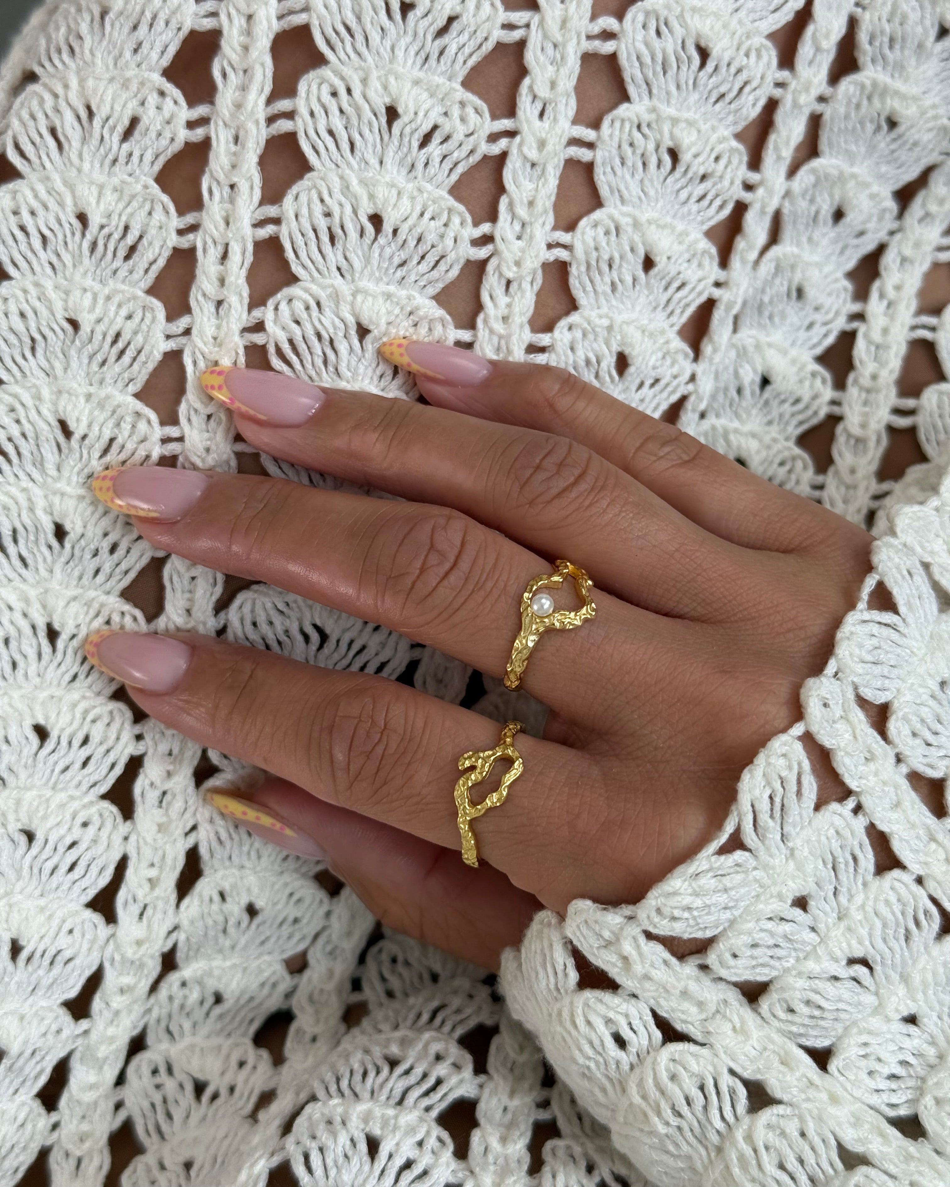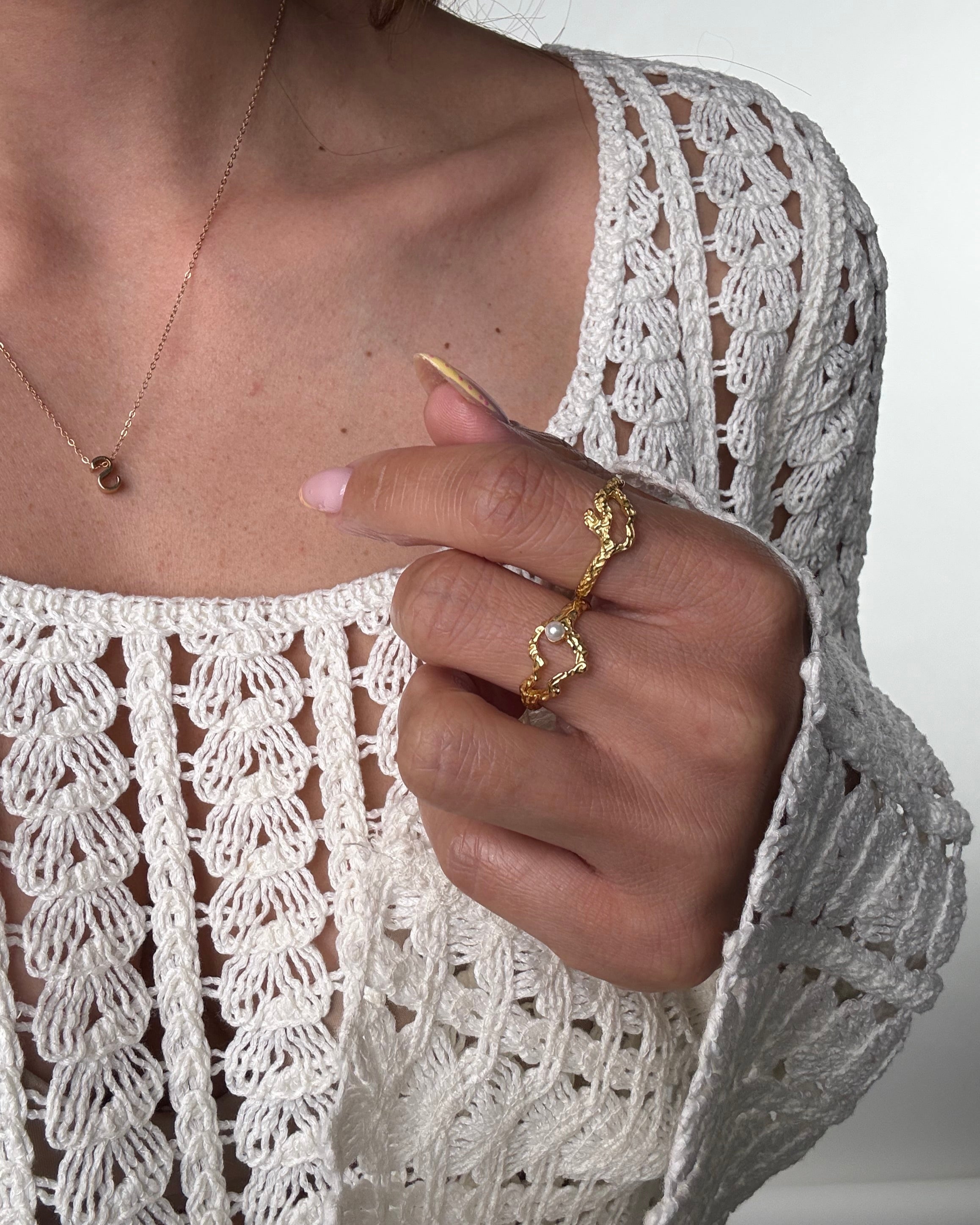 Ezili Ring has a unique mix of an organic expression and feminine style. The ring is made with an open, hammered design and has a beautiful pearl in the center, creating an elegant and enchanting look. The Ezili Ring is part of the Reef collection, which is inspired by the beautiful coral reef.
