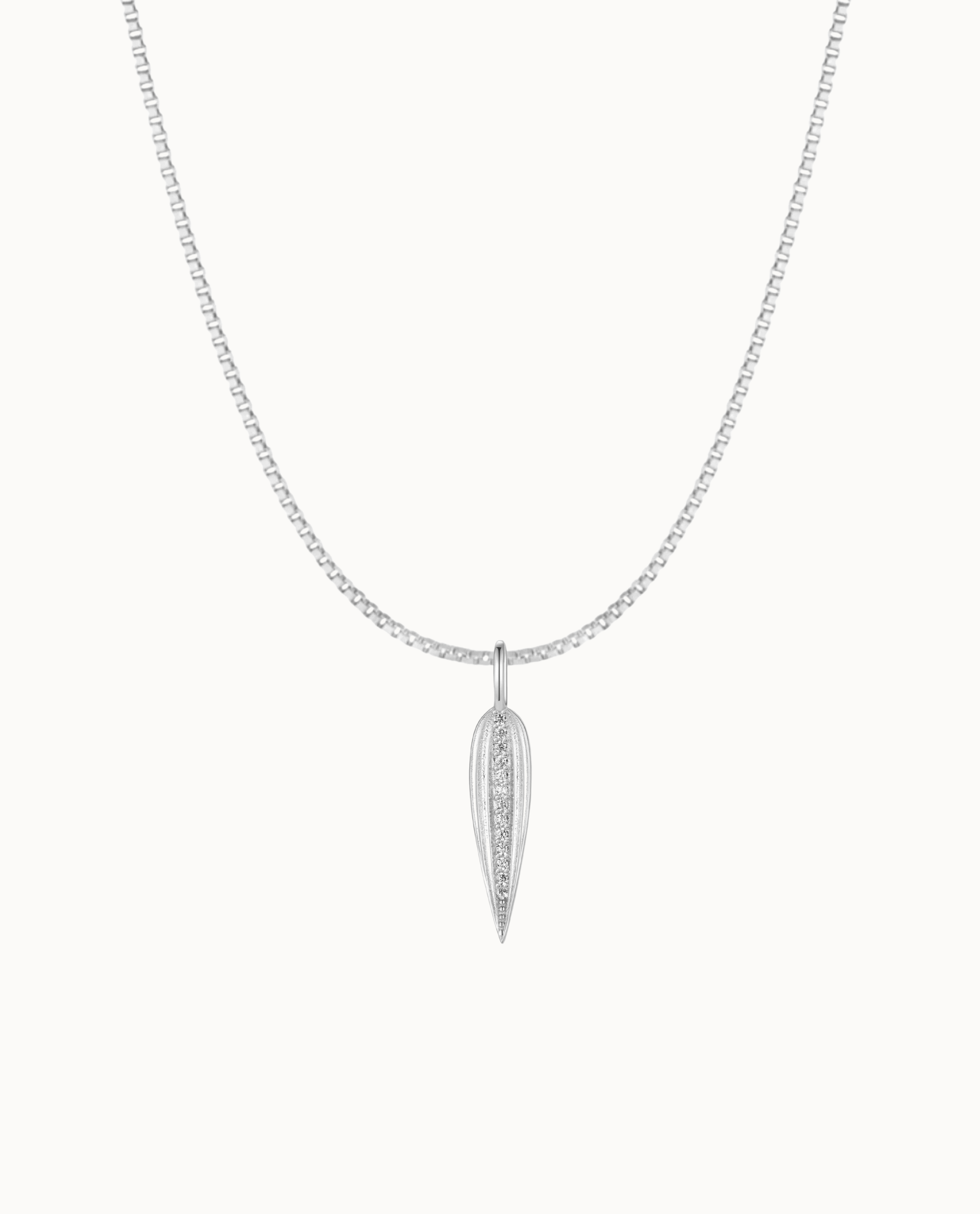 Immerse yourself in the enchanting beauty of nature with our breathtaking Lai Necklace - a beautiful necklace inspired by bamboo. This unique piece pays tribute to the graceful elegance of the bamboo plant and will add a sublime and radiant charm to your necklace collection. Carefully crafted with an eye for detail, the Lai Necklace is shaped like a graceful bamboo leaf. A touch of elegance is added with small cubic zirconias running down the center of the blade. These sparkling stones bring a delicate shine to the pendant, creating a perfect balance between natural beauty and subtle luxury.