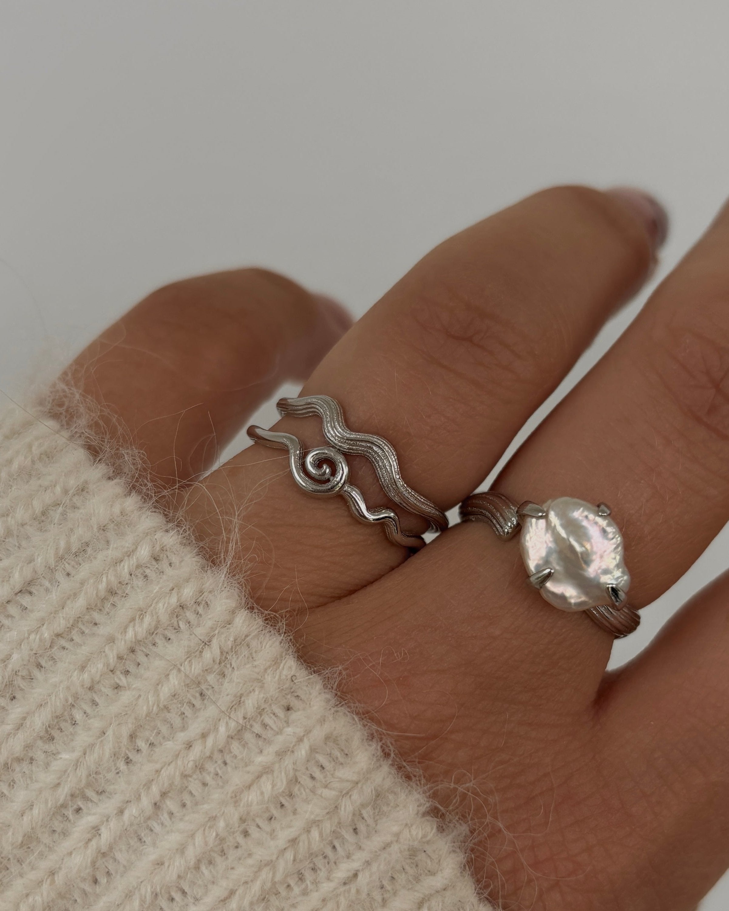 The Lorien Ring is an enchanting ring that captures attention with its unique beauty. It is adorned with a large, irregular freshwater pearl that creates a unique and natural center. Inspired by the waves of the ocean, the ring has an undulating texture that adds depth and character to its design.