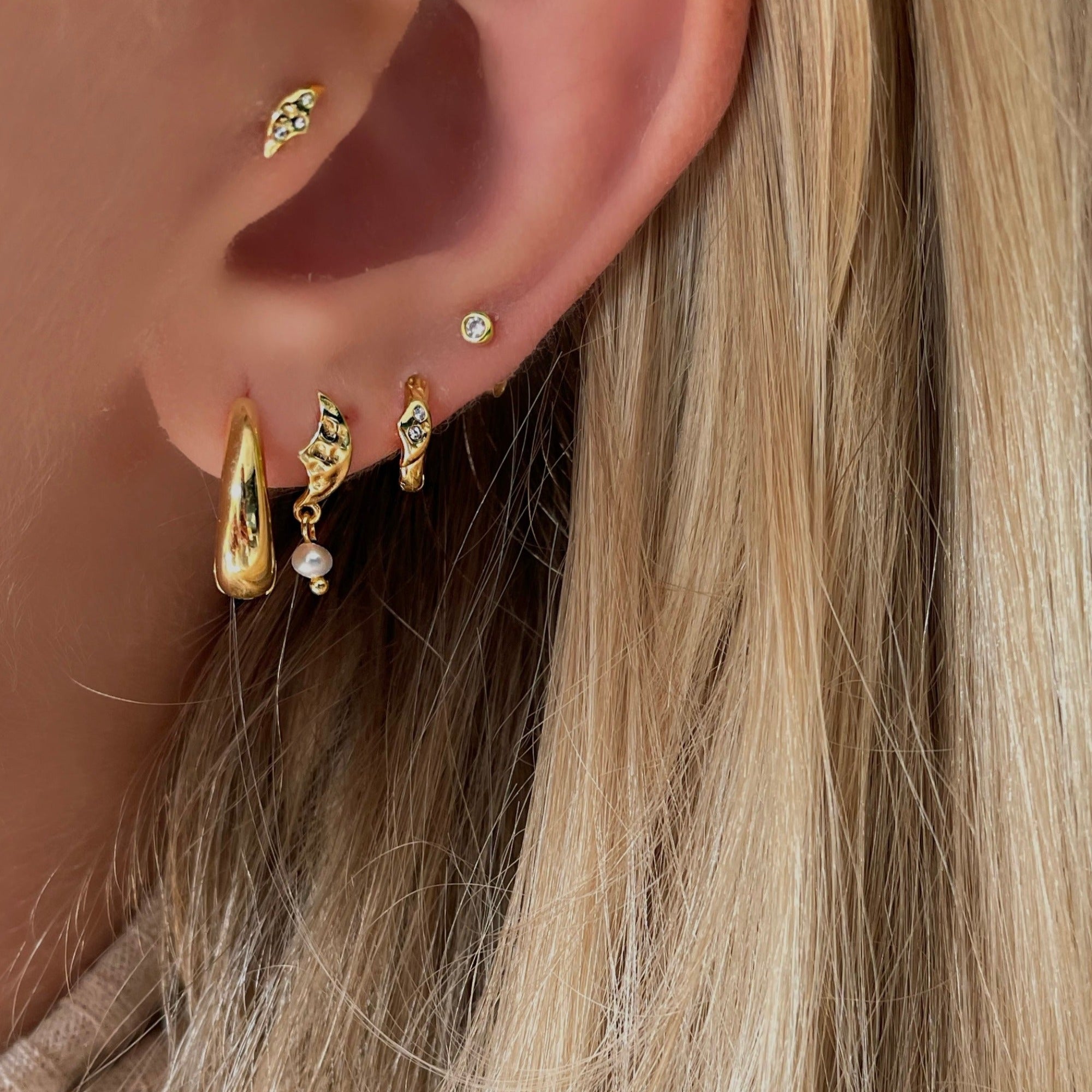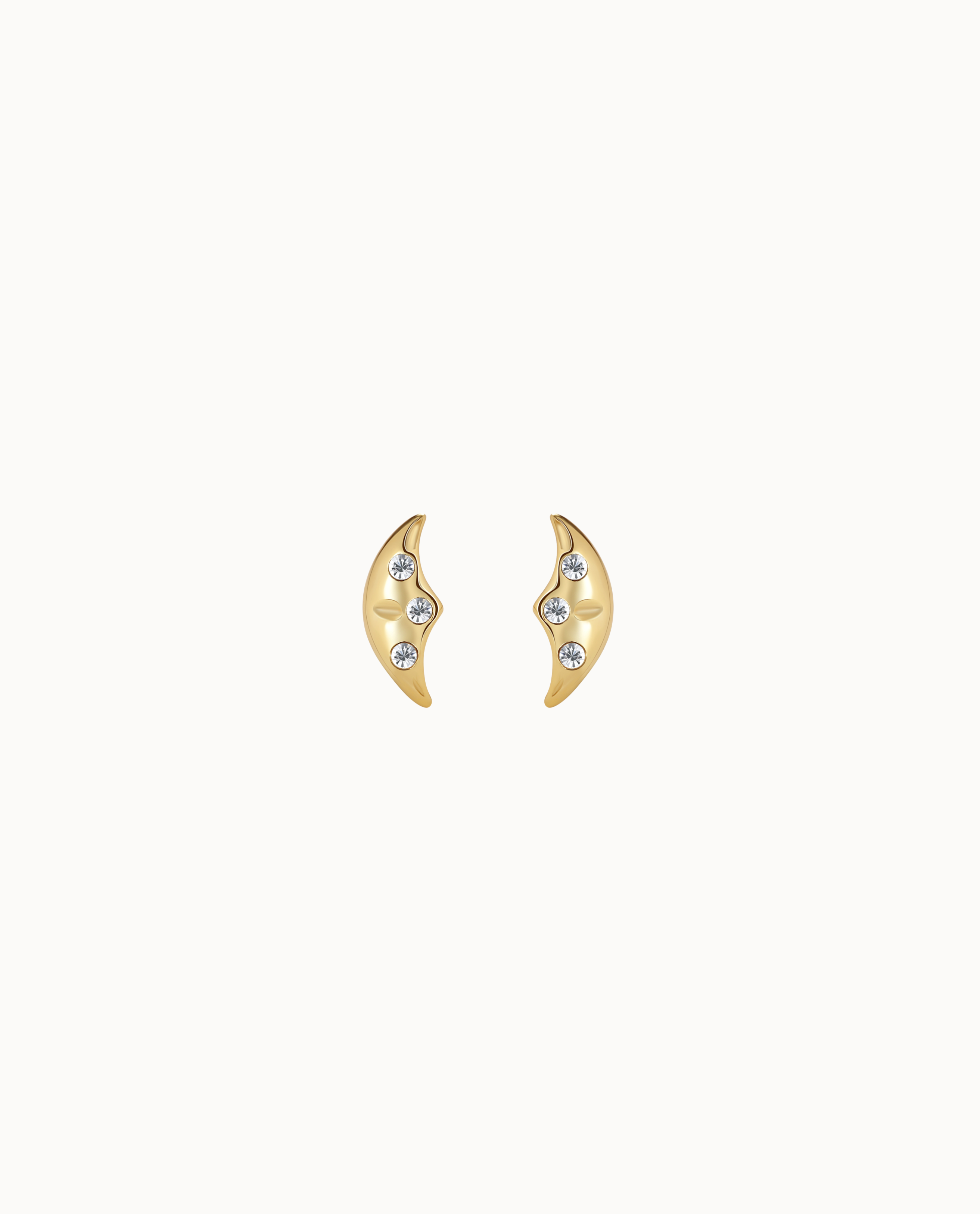Ayla Petite studs are a beautiful little ear stud shaped like a moon. The earring has three small cubic zirconias, which give the earring a magical expression. Ayla Petite Studs is part of our Moonshine Collection, which is inspired by the enchanting and magical night sky. The stud can easily be styled alone, for a simple and magical expression, but can also be easily styled with other earrings, for a more stacked look.