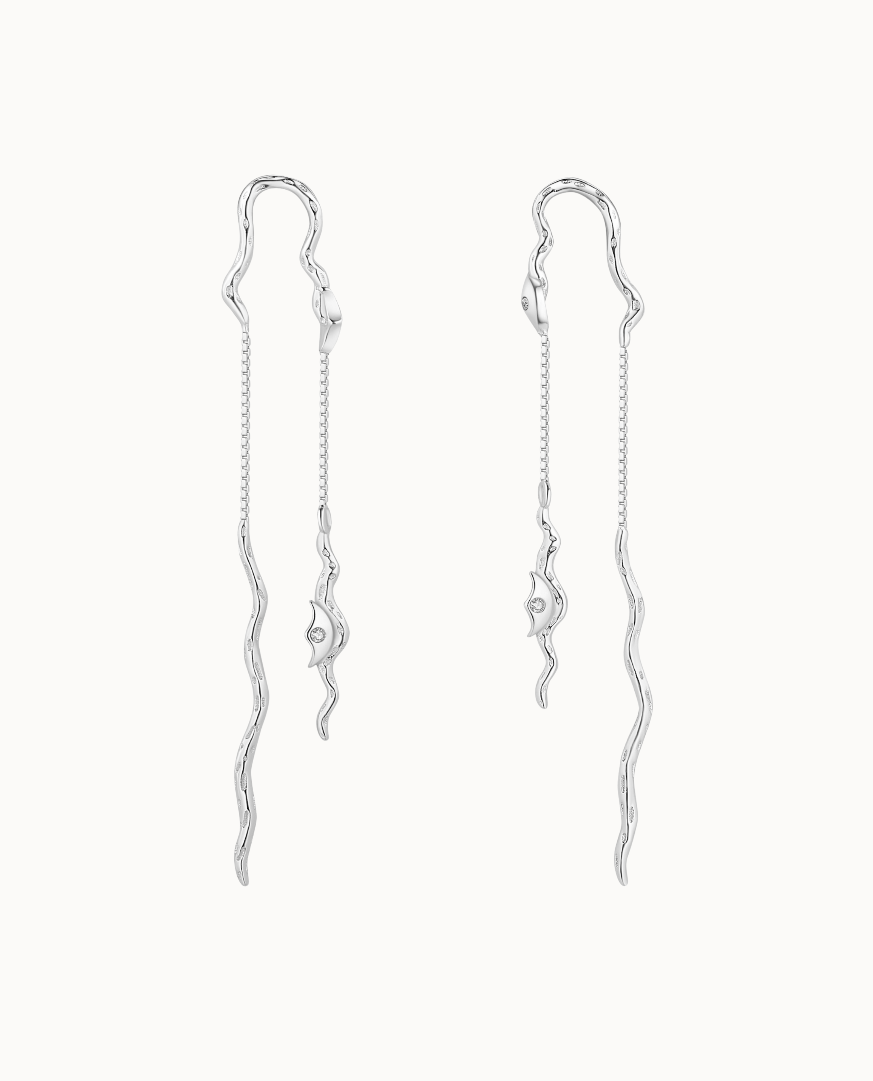 Our beautiful Mahina Earrings are a longer ear thread with fine enchanting details. The earring waves and winds beautifully through the ear while creating a magical expression. The earring has two inset moons and small cubic zirconias. Mahina is part of our Moonshine Collection, which is inspired by the enchanting and magical night sky. The ear wire can be easily styled on its own, but is also beautiful together with other magical earrings.
