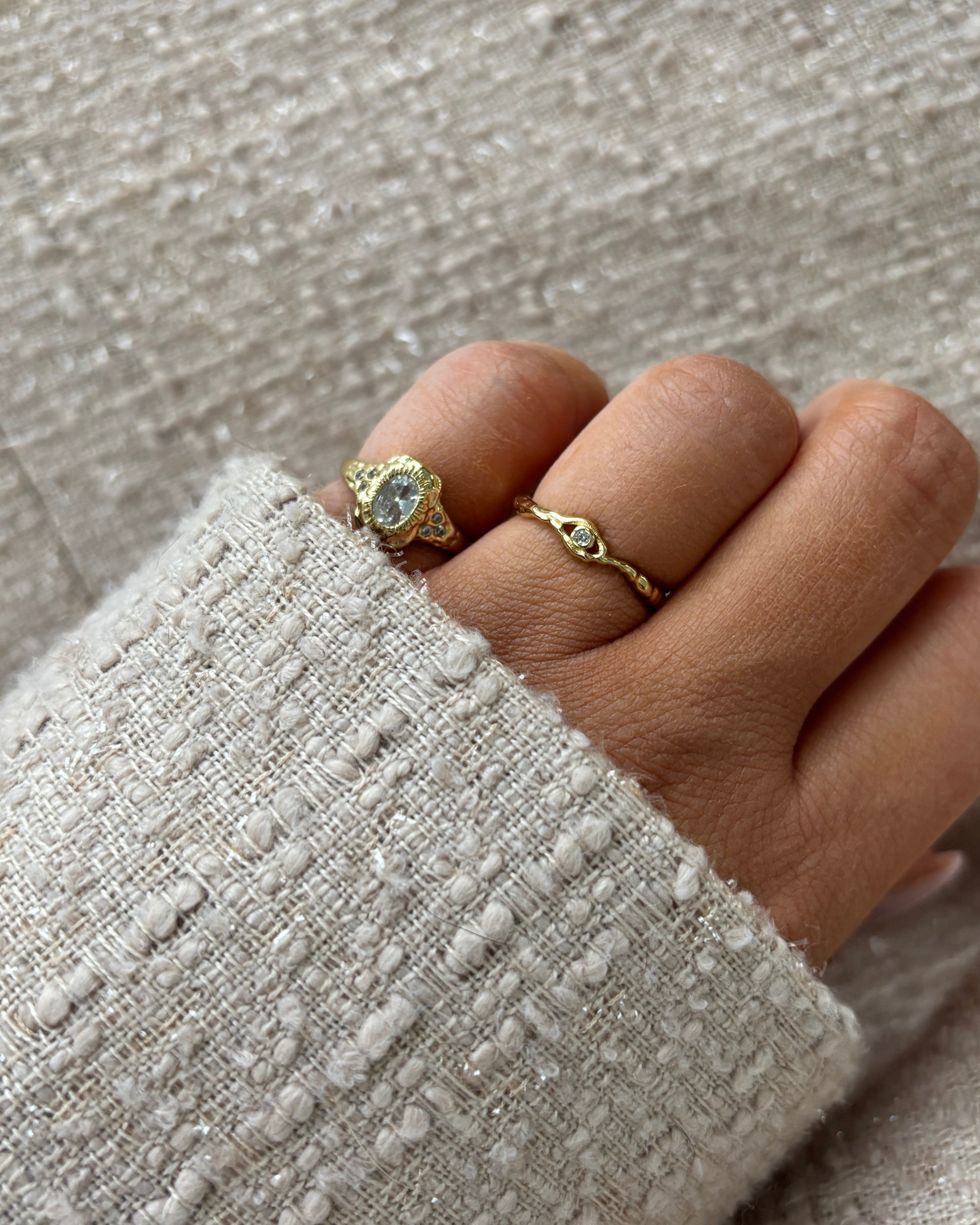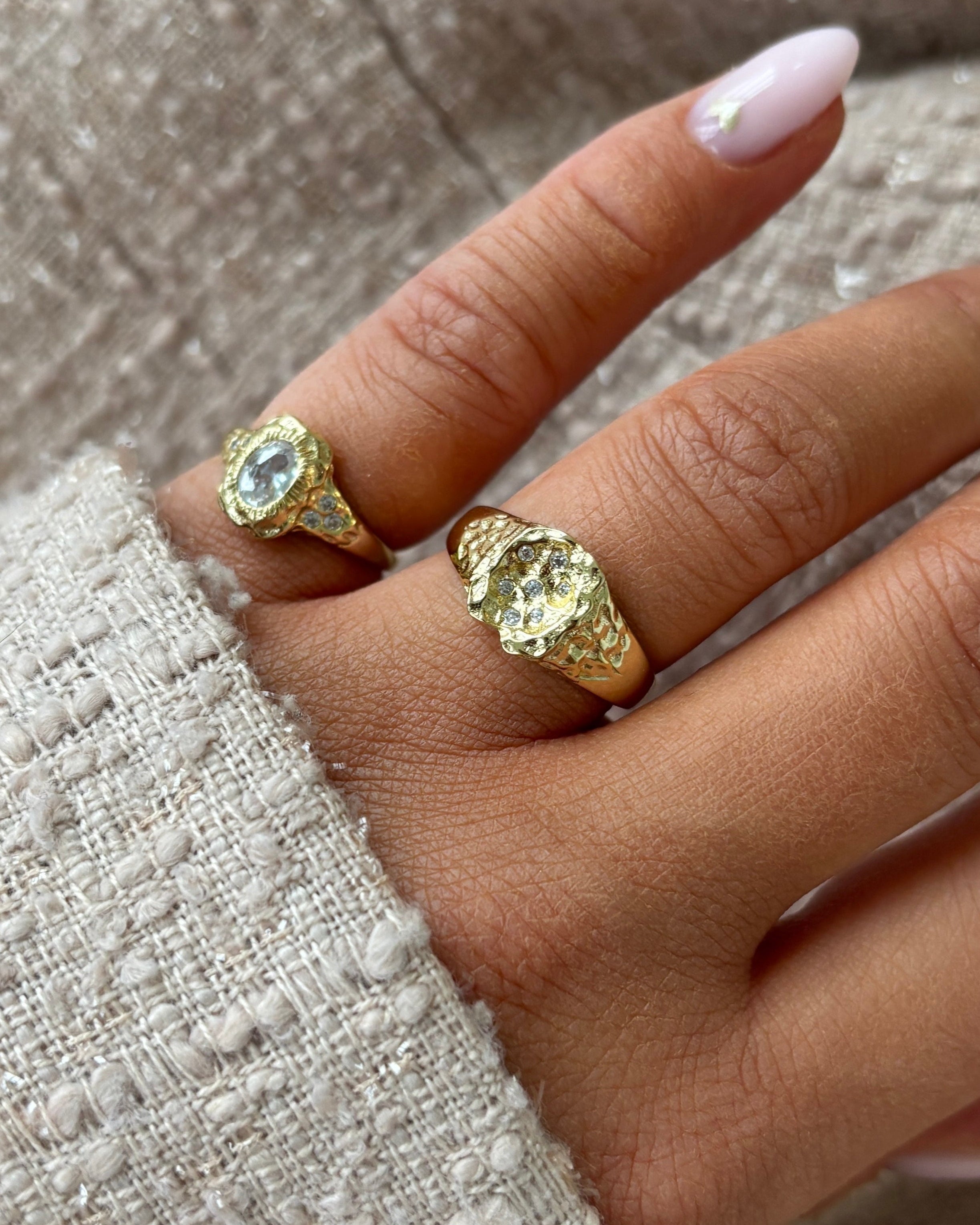 Atum ringen er et smykke med en stærk tilstedeværelse. Det store, klare zirkon i midten er omkranset af detaljerede teksturer, der leder tankerne hen på solens stråler, mens de mindre zirkoner på siden tilføjer et subtilt spil af lys. Ringen har en organisk og eksklusiv form, der gør den til en iøjnefaldende detalje til ethvert outfit.