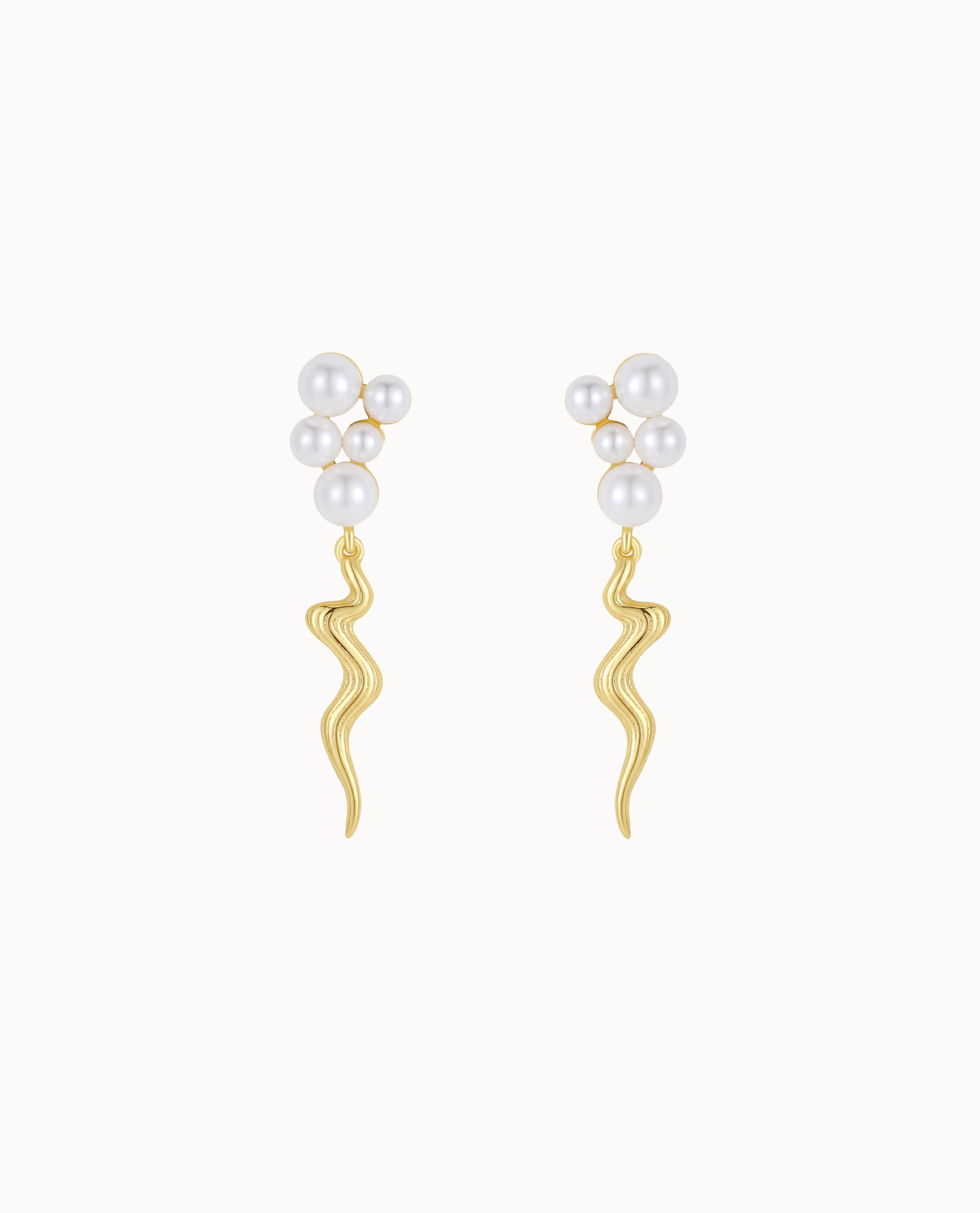 Kanasu Earrings er et par fortryllende ørestikker, der kombinerer elegant design med naturlig skønhed. Disse større ørestikker er udsmykket med smukke detaljer, der gør dem til et fremtrædende smykke i enhver samling. Øverst prydes øreringene af en klase af delikate skalperler, som tilføjer et subtilt og raffineret element. Nederst afsluttes øreringene med et vedhæng i en bølget struktur, inspireret af havets dynamiske og bølgende bevægelser.