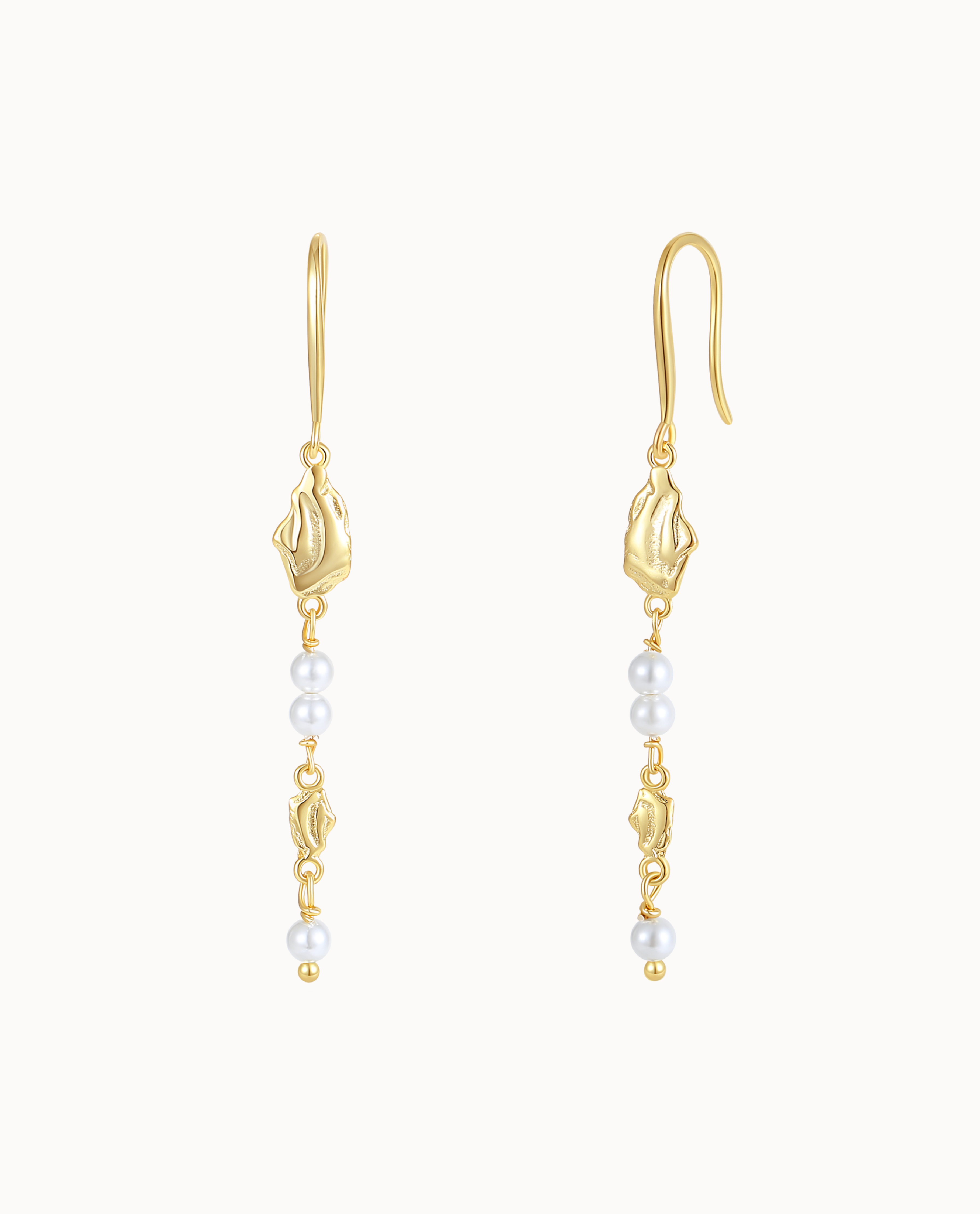Maui Earrings er lange, lette øreringe, der kombinerer små perler med skulpturelle havinspirerede detaljer. De fine elementer leder tankerne hen på strandfund og koraller, mens de små perler tilføjer et feminint og elegant udtryk. Et design skabt til at bevæge sig blødt i takt med dig – som bølgerne langs kysten.