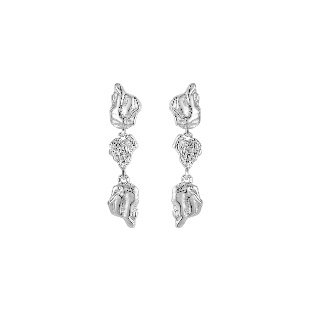Arihi Earrings er dråbeformede øreringe, inspireret af kystens rå teksturer og naturlige former. De består af tre unikke, organisk formede elementer, hvor det midterste har en let hjerteformet struktur, der giver et subtilt romantisk touch. Den ujævne, havinspirerede overflade reflekterer lyset på en måde, der minder om solstråler på klipper og våde sten.