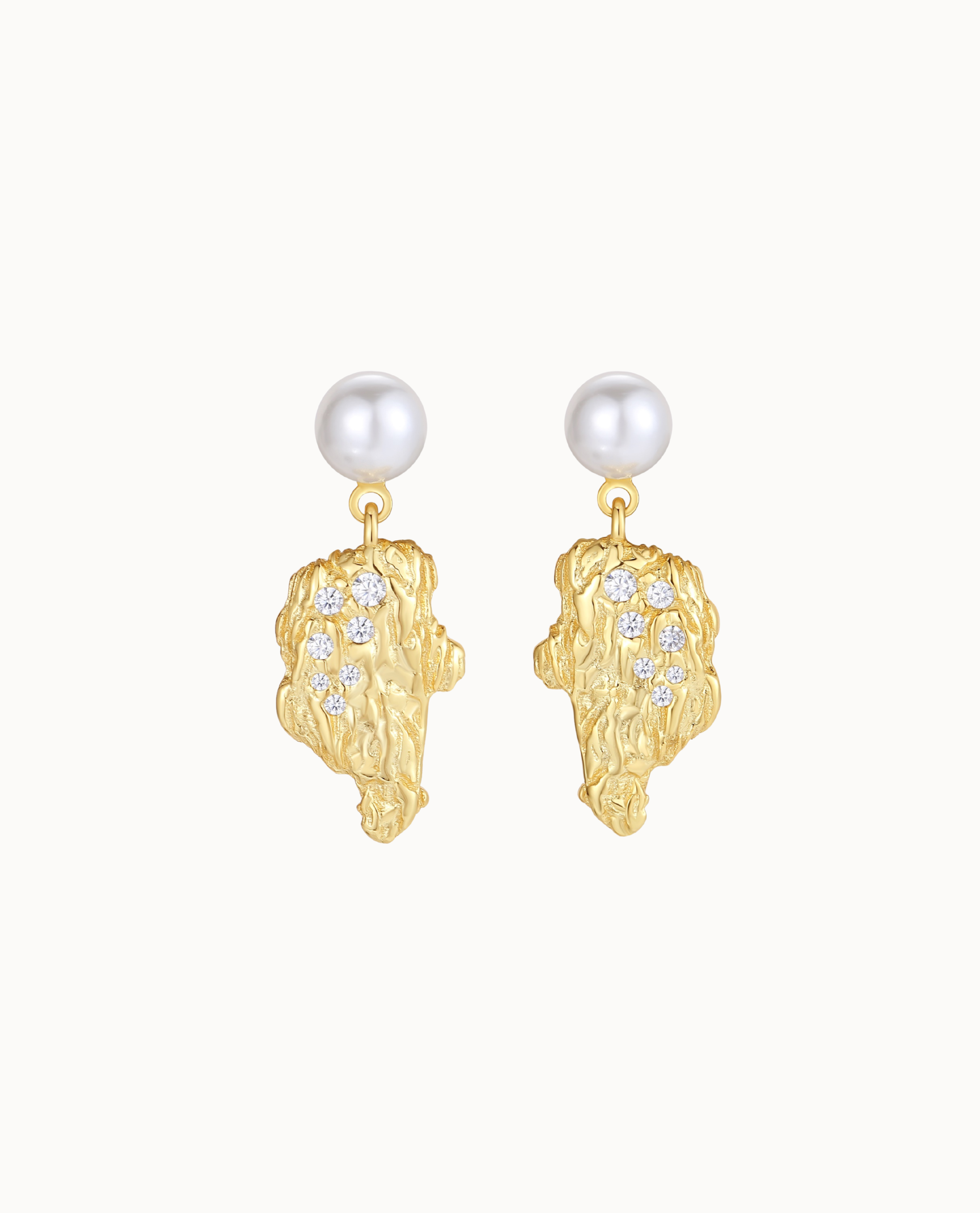Gaia Earrings er en skøn statement-ørering, der fusionerer elegance med naturens enkelhed. Den starter med en smuk skalperle og udfolder sig i et struktureret vedhæng med en organisk form. Øreringens unikke design omfavner naturens skønhed, og vedhænget, der er indlagt med små kubiske zirkoner, tilføjer et subtilt glimt. Gaia Earrings er mere end bare et smykke; det er en stilsikker erklæring om forbindelsen til jorden og elementerne. Bær denne ørering som et symbol på din unikke skønhed og kærlighed til naturen.