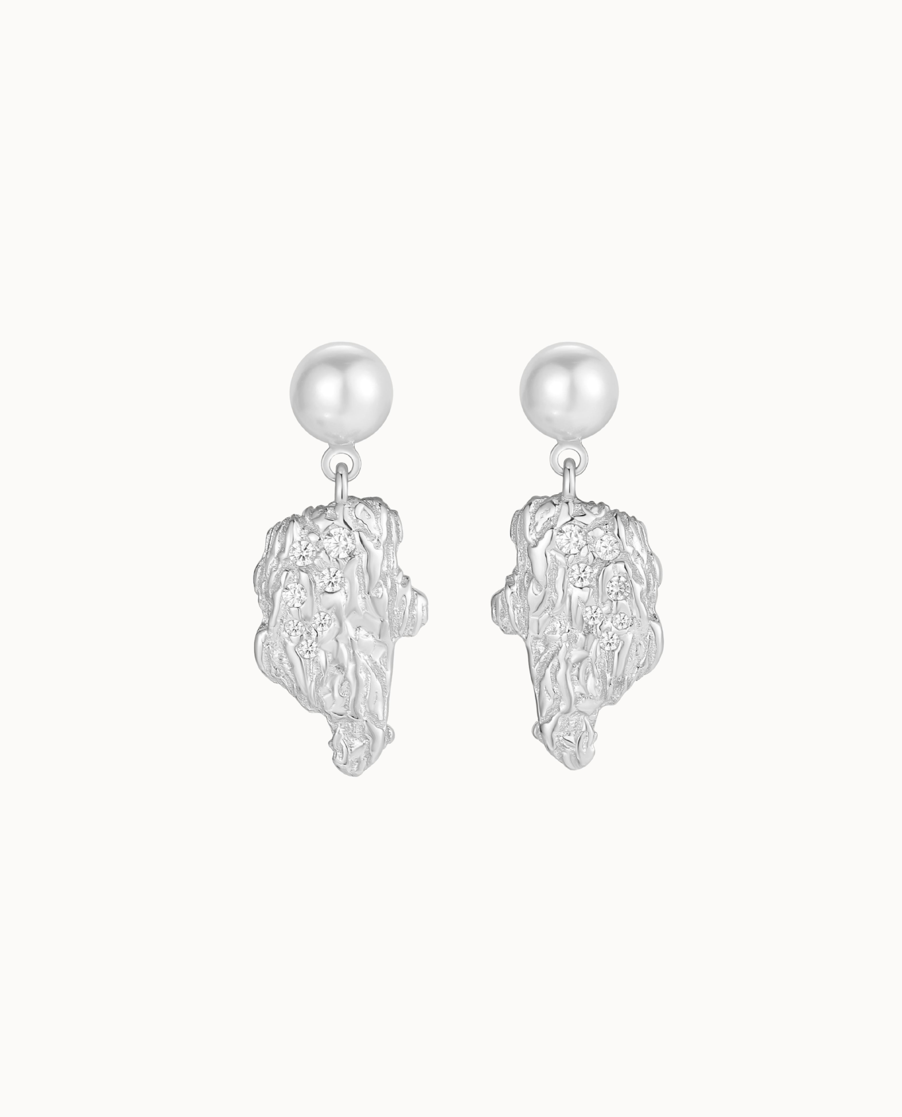 Gaia Earrings er en skøn statement-ørering, der fusionerer elegance med naturens enkelhed. Den starter med en smuk skalperle og udfolder sig i et struktureret vedhæng med en organisk form. Øreringens unikke design omfavner naturens skønhed, og vedhænget, der er indlagt med små kubiske zirkoner, tilføjer et subtilt glimt. Gaia Earrings er mere end bare et smykke; det er en stilsikker erklæring om forbindelsen til jorden og elementerne. Bær denne ørering som et symbol på din unikke skønhed og kærlighed til naturen.