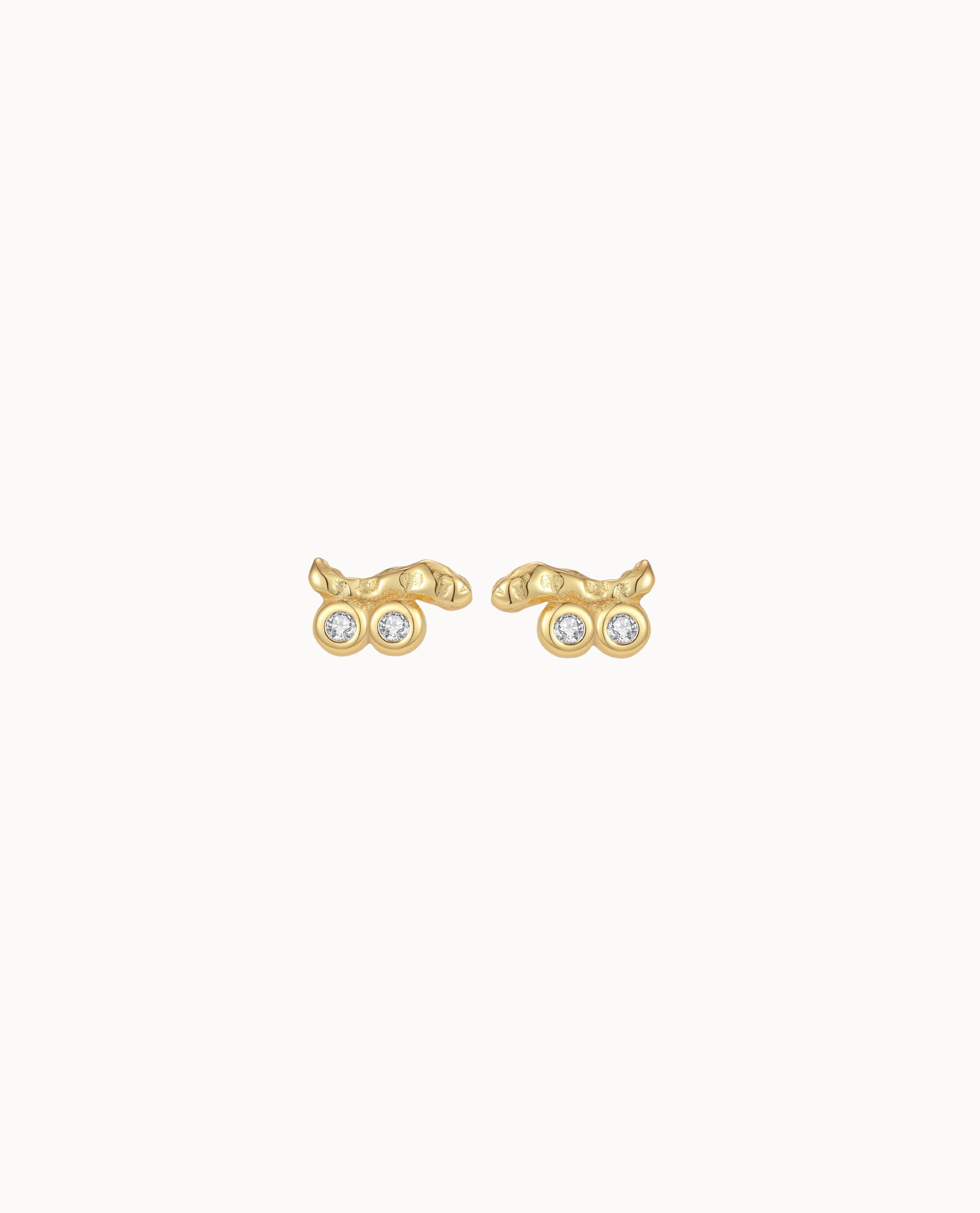 Horea Petite Studs har et unikt design med en organisk tekstur, der leder tankerne hen på naturens rå skønhed. De to funklende zirkoner tilføjer et strejf af elegance til de små studs.