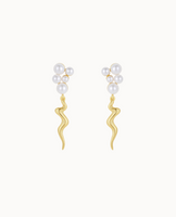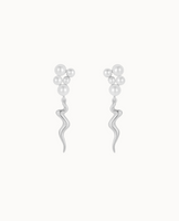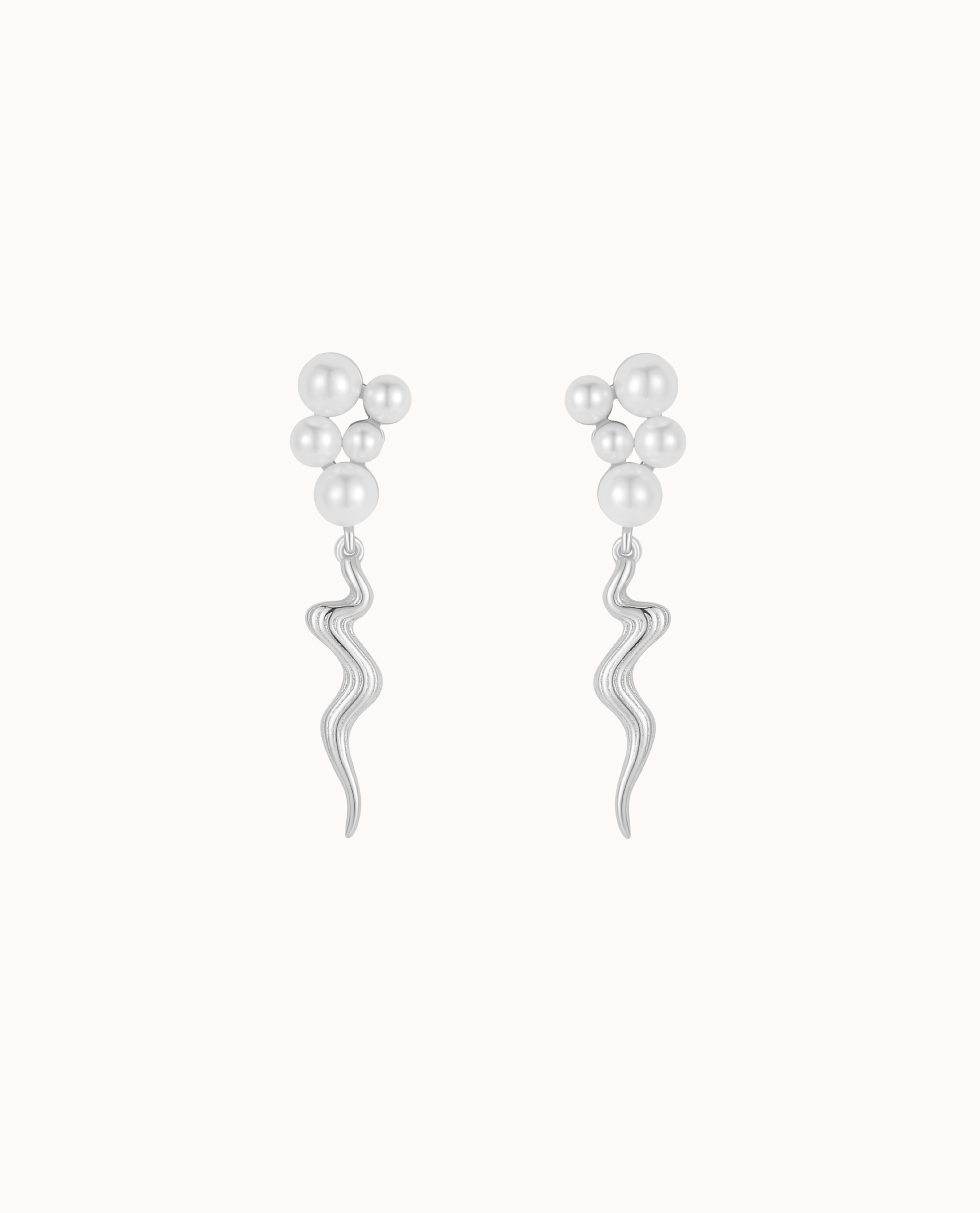 Kanasu Earrings er et par fortryllende ørestikker, der kombinerer elegant design med naturlig skønhed. Disse større ørestikker er udsmykket med smukke detaljer, der gør dem til et fremtrædende smykke i enhver samling. Øverst prydes øreringene af en klase af delikate skalperler, som tilføjer et subtilt og raffineret element. Nederst afsluttes øreringene med et vedhæng i en bølget struktur, inspireret af havets dynamiske og bølgende bevægelser.